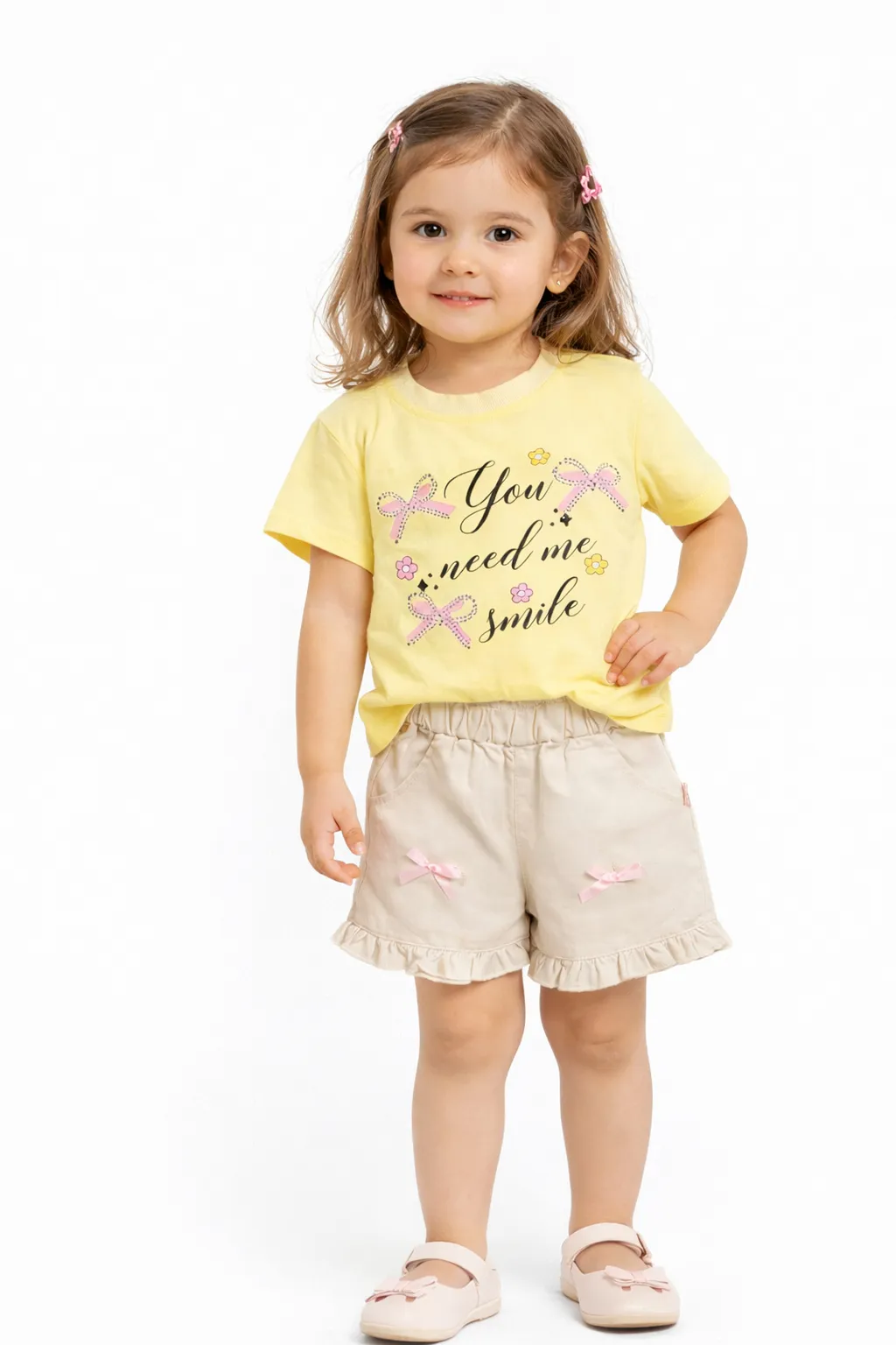 Girls' 2-Piece Summer Set – Yellow "You Need Me Smile" T-Shirt & Ruffle Shorts with Bows