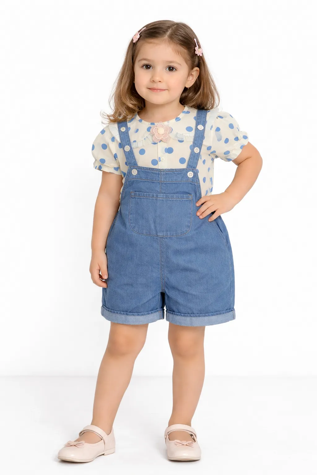 Girls' 2-Piece Summer Set – Blue Polka Dot Blouse & Bunny Ear Denim Overall Shorts