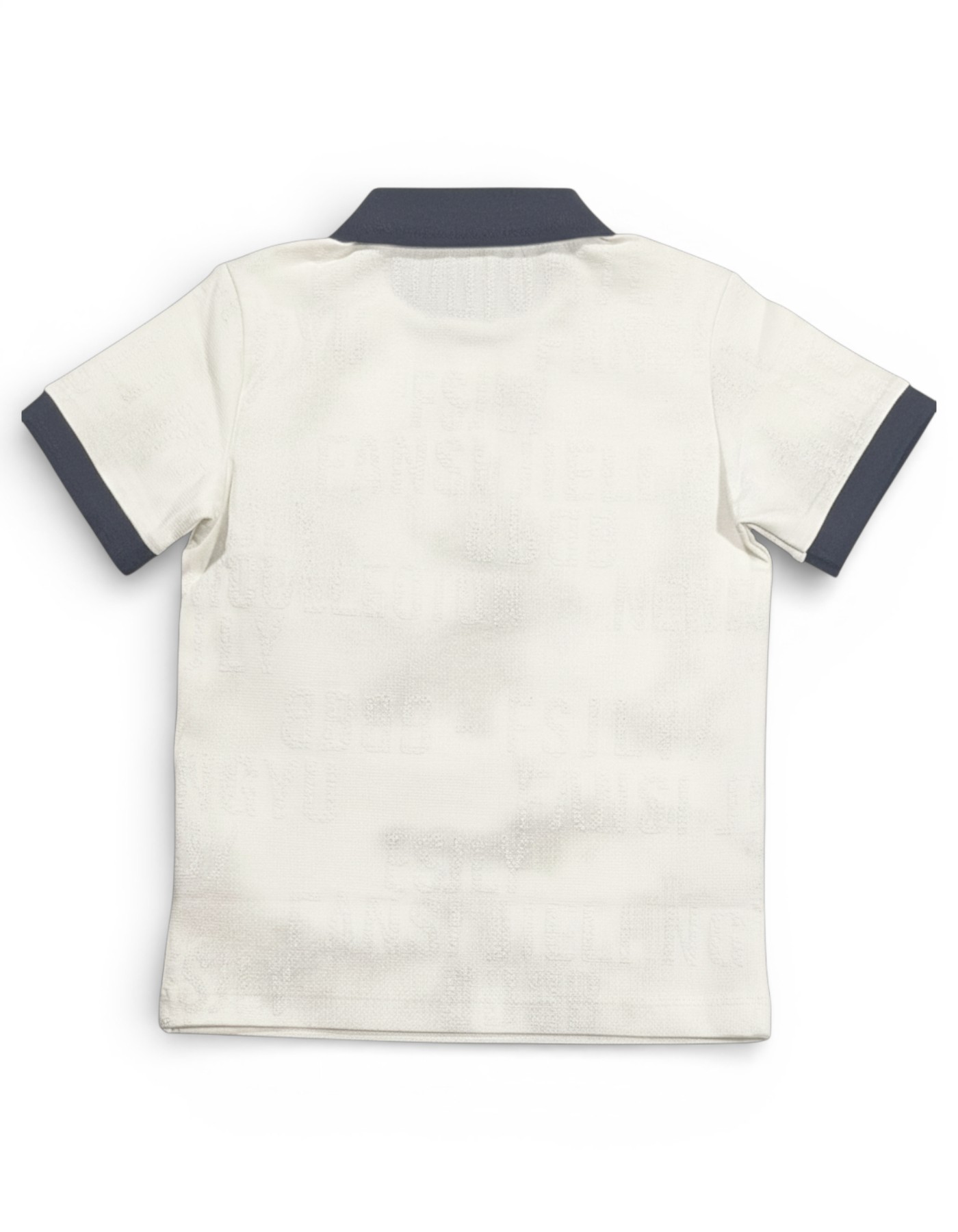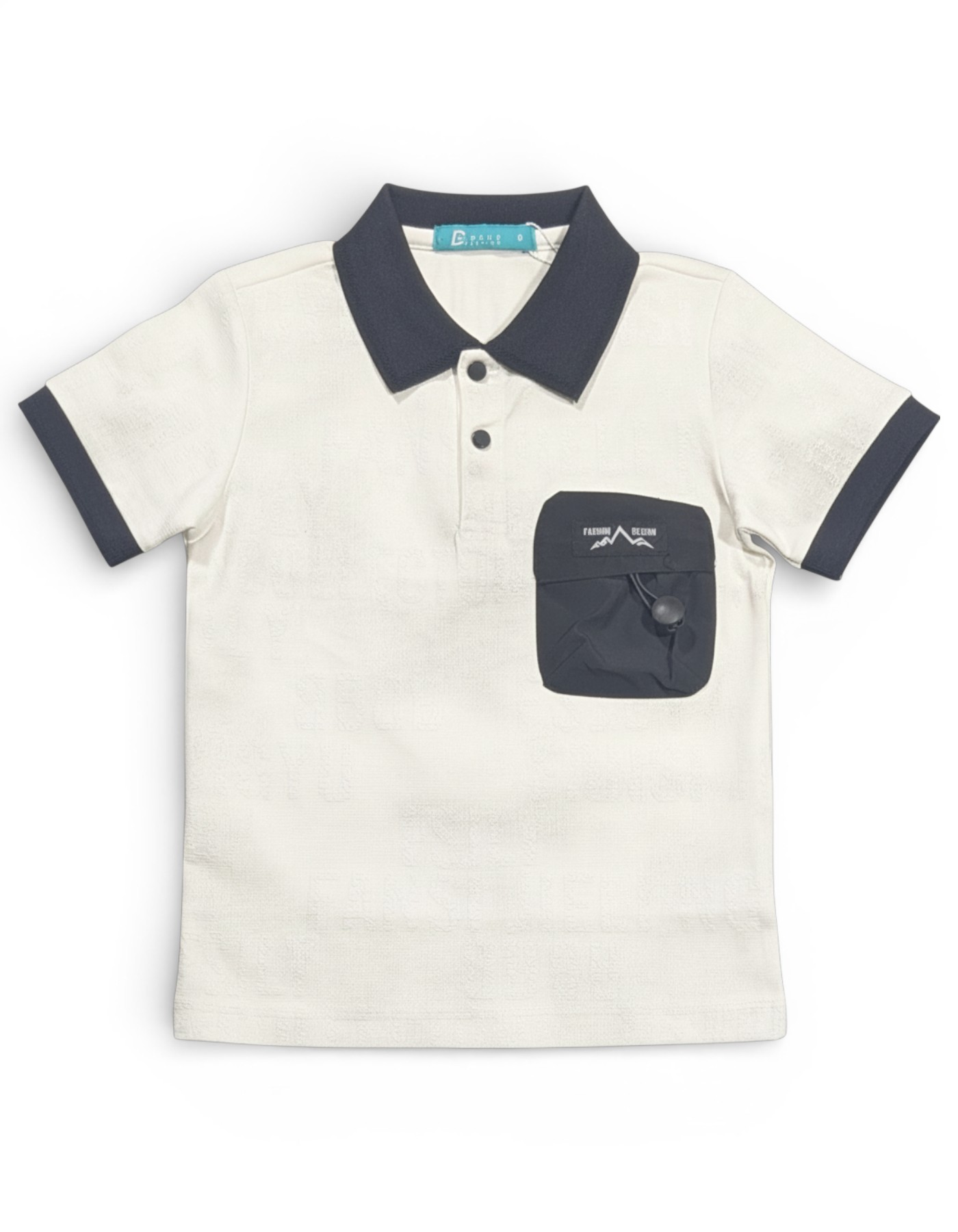 This isn't your average polo shirt. Designed for the boy who is always on the move, it features a striking off-white body contrasted by deep charcoal accents on the collar and cuffs. The standout feature is the functional, tactical-style chest pocket, complete with a rugged mountain graphic and an adjustable bungee drawcord—perfect for a modern, utilitarian look.