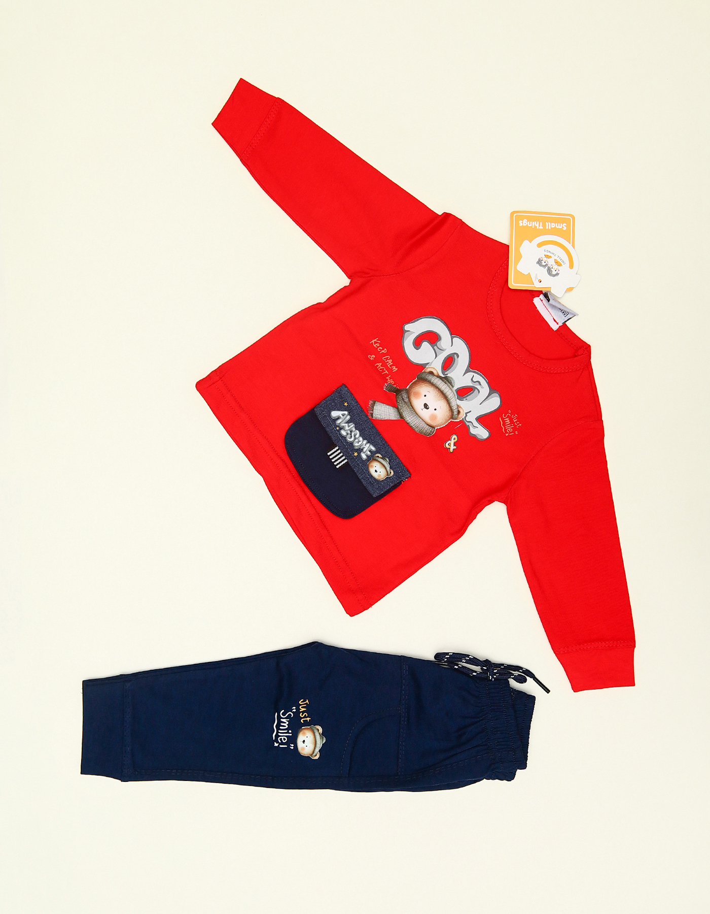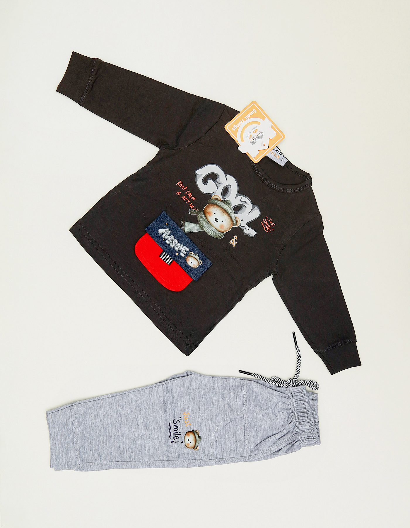 Soft two-piece set for kids featuring a black graphic top and light gray pants with cute bear accents. Comfortable and easy wear for everyday play.