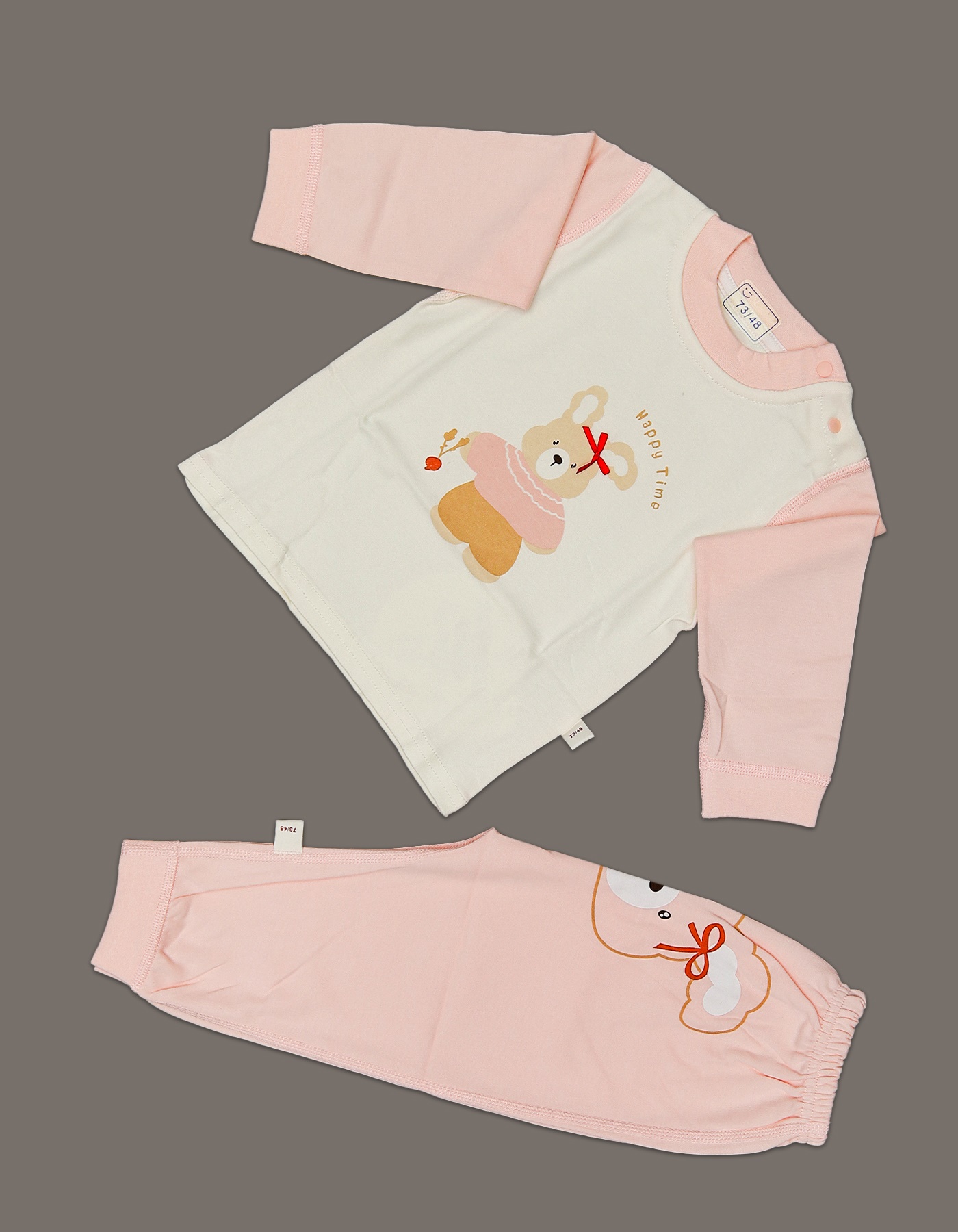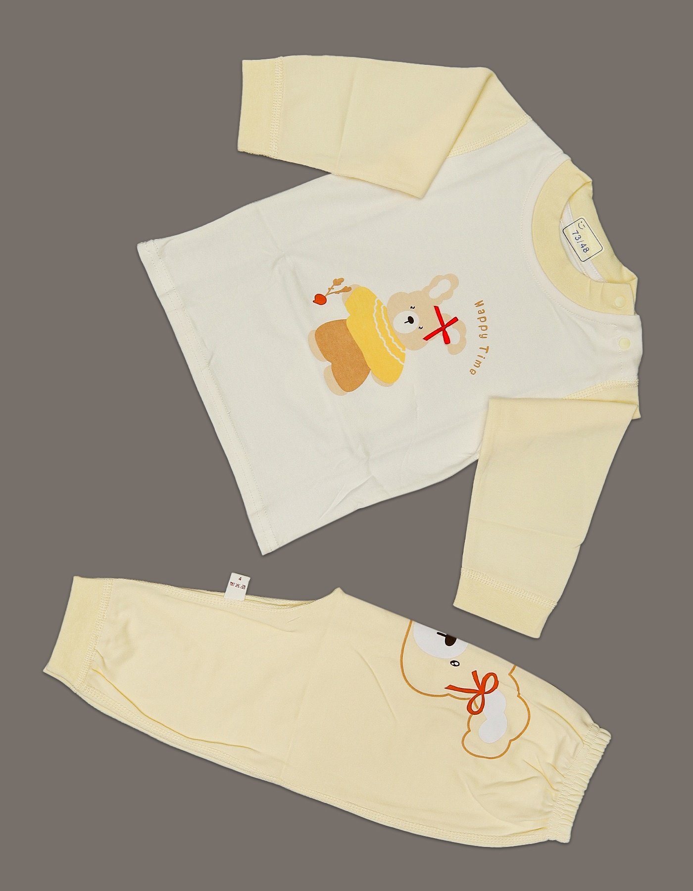 Soft cream pajama set with pale yellow sleeves and matching pants, featuring a cheerful bear print. Cozy and breathable for bedtime.