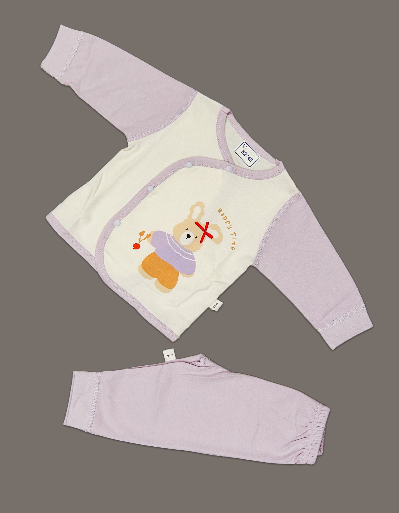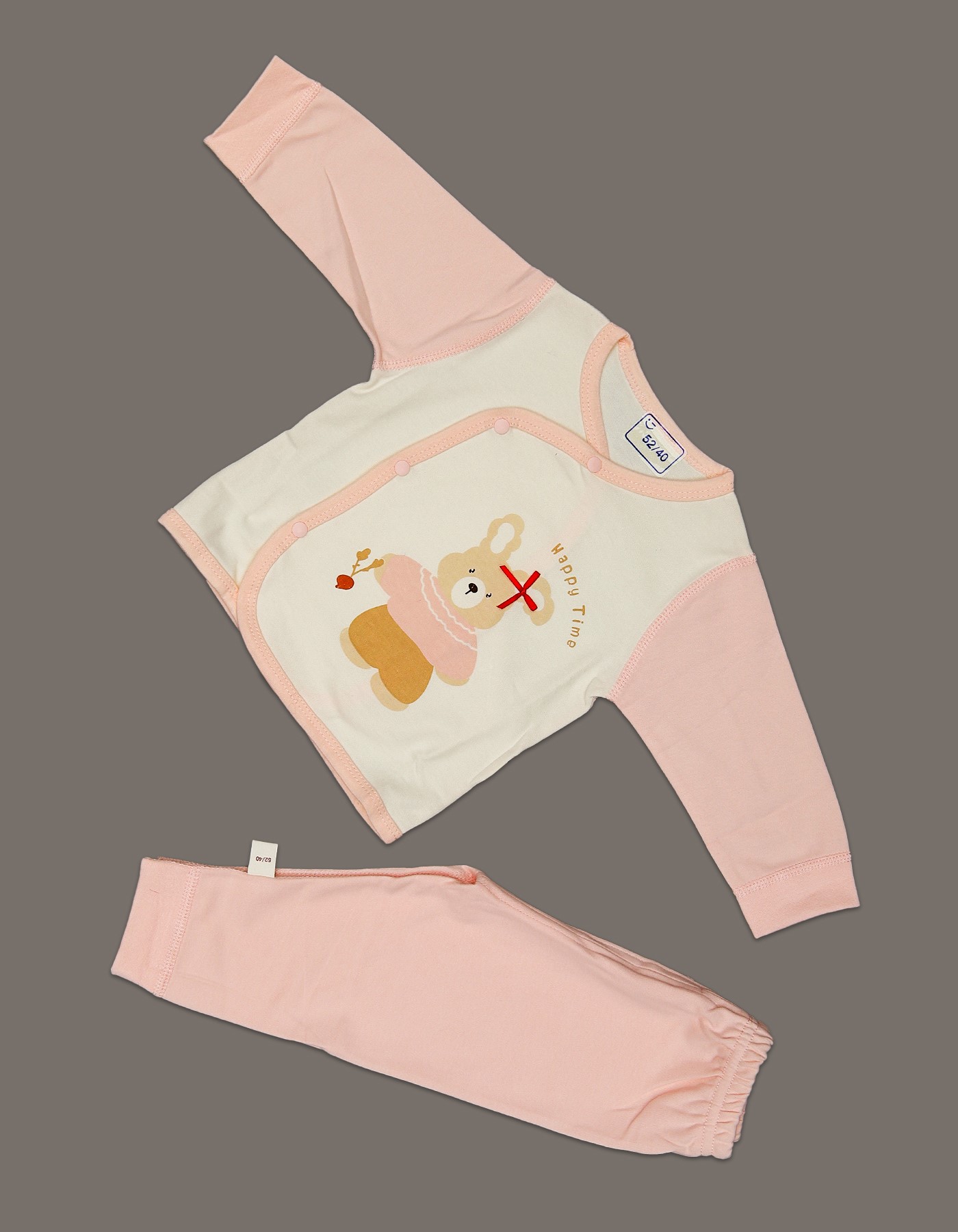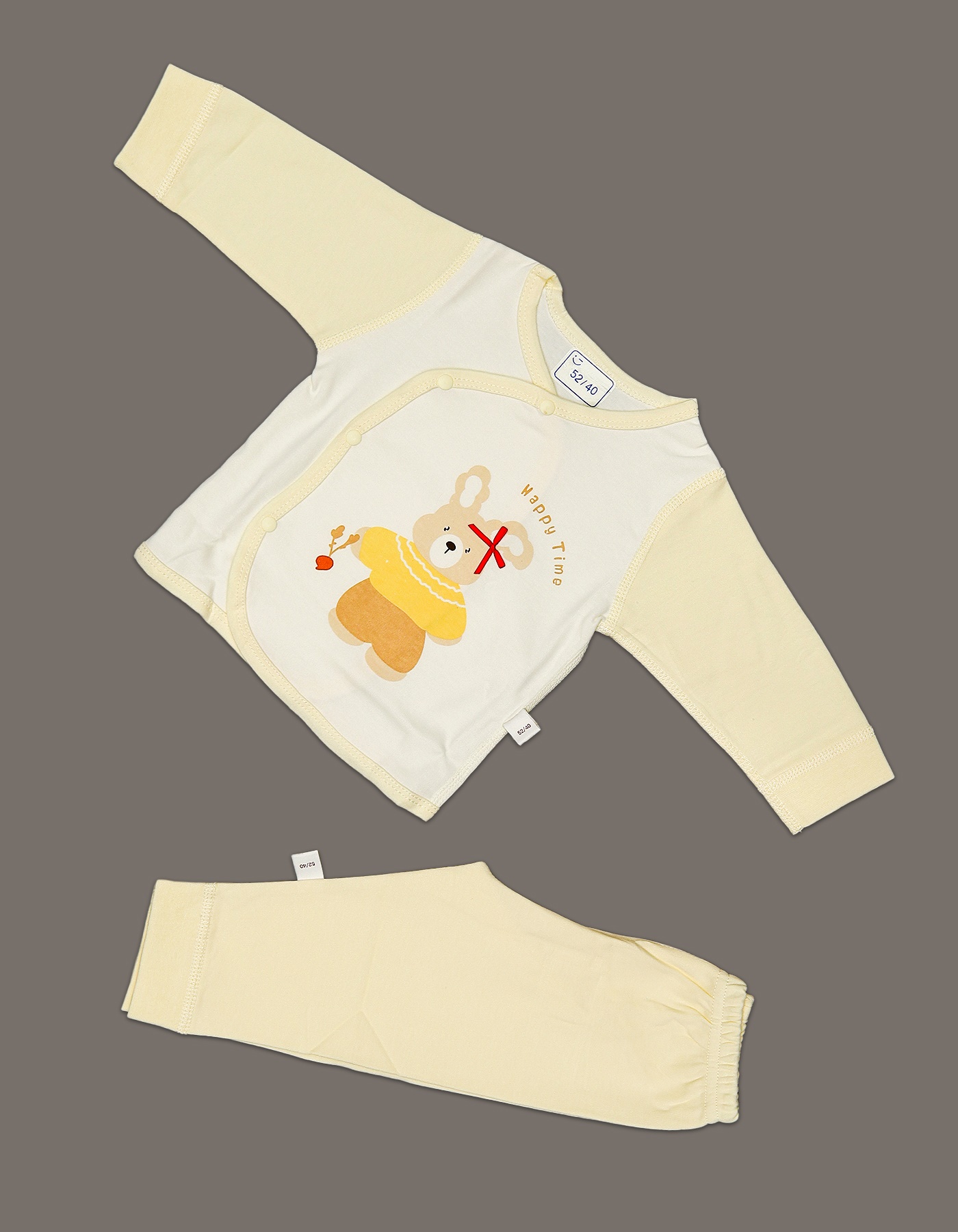 Soft cream pajama set for babies with pale yellow sleeves and bear print. Cozy and comfortable for bedtime.