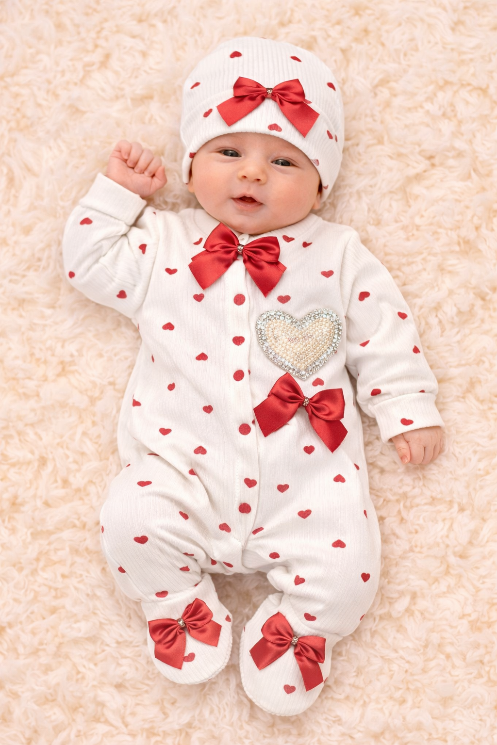 Dress your little one in adorable comfort with this White & Red Heart Print Baby Romper Set, designed to keep your baby cozy and picture-perfect all day long. Made from soft, breathable fabric, this full-sleeve romper is gentle on delicate skin and perfect for everyday wear or special occasions. Featuring an all-over red heart print, charming satin bow details, and a sparkling heart applique on the chest, this outfit adds a sweet and stylish touch. The convenient front button closure ensures easy dressing and diaper changes, while the attached footed design keeps tiny toes warm and snug. This set comes complete with a matching cap and mittens, beautifully coordinated with red bow accents for an extra dose of cuteness.