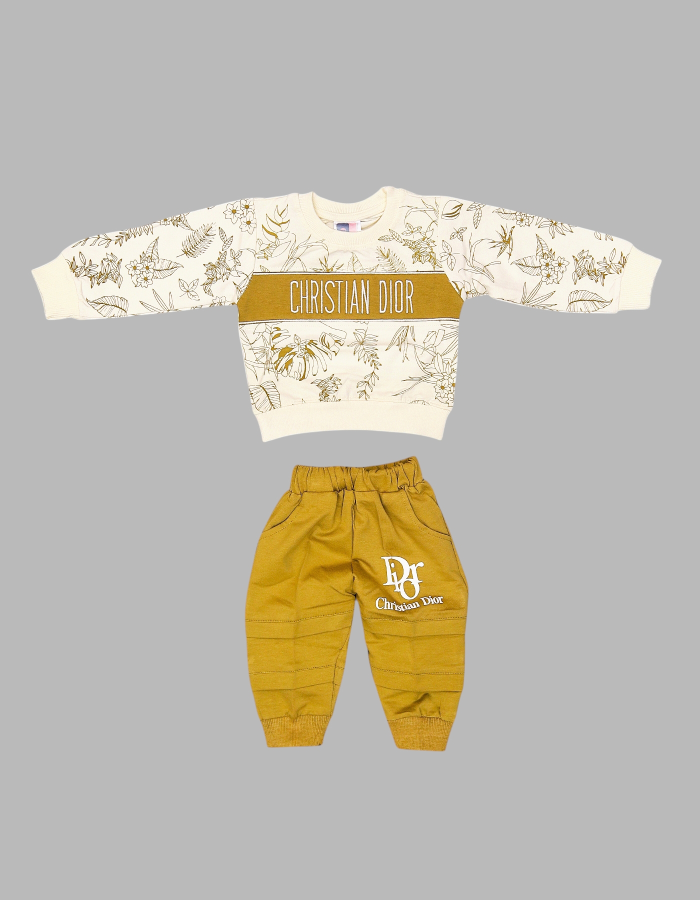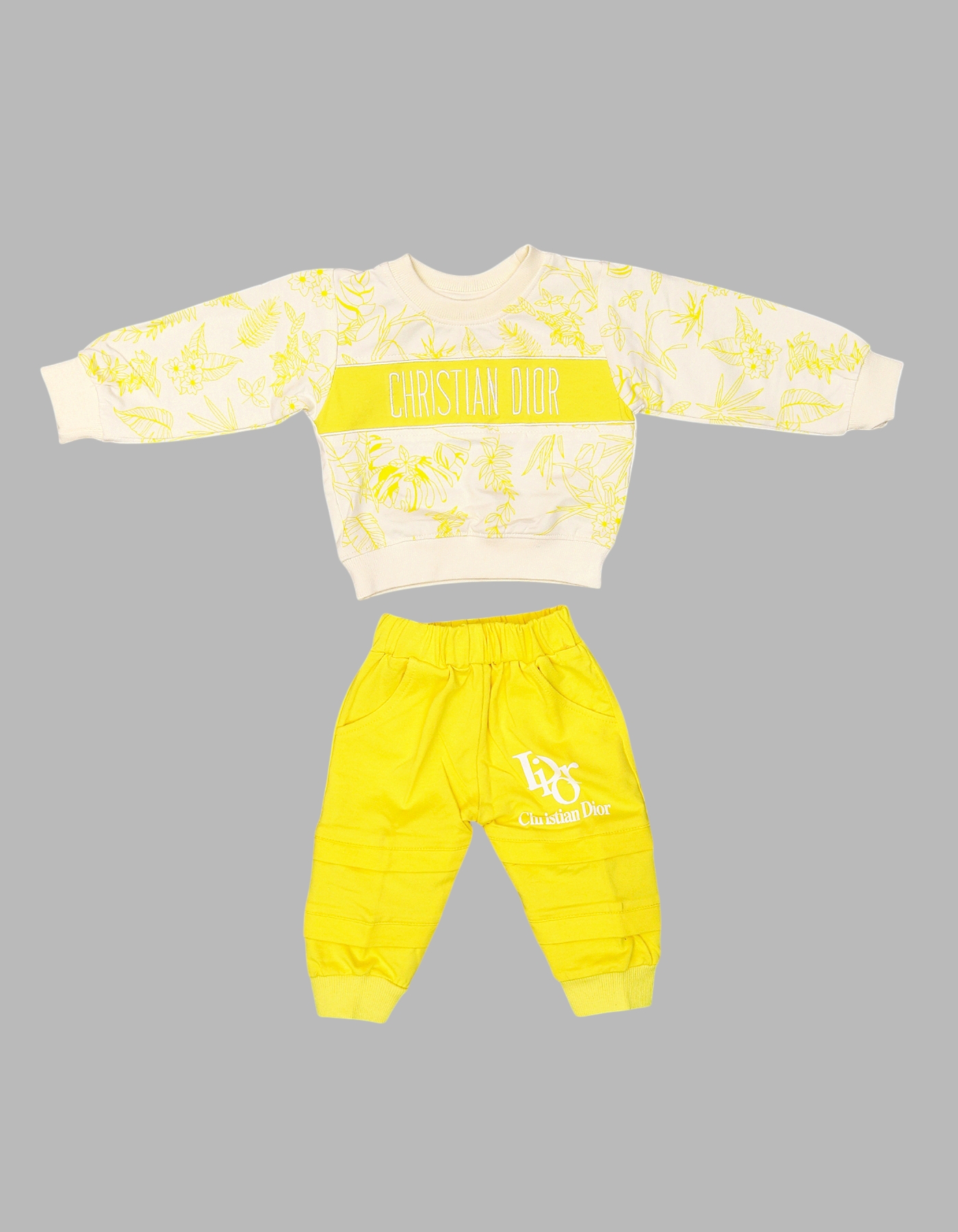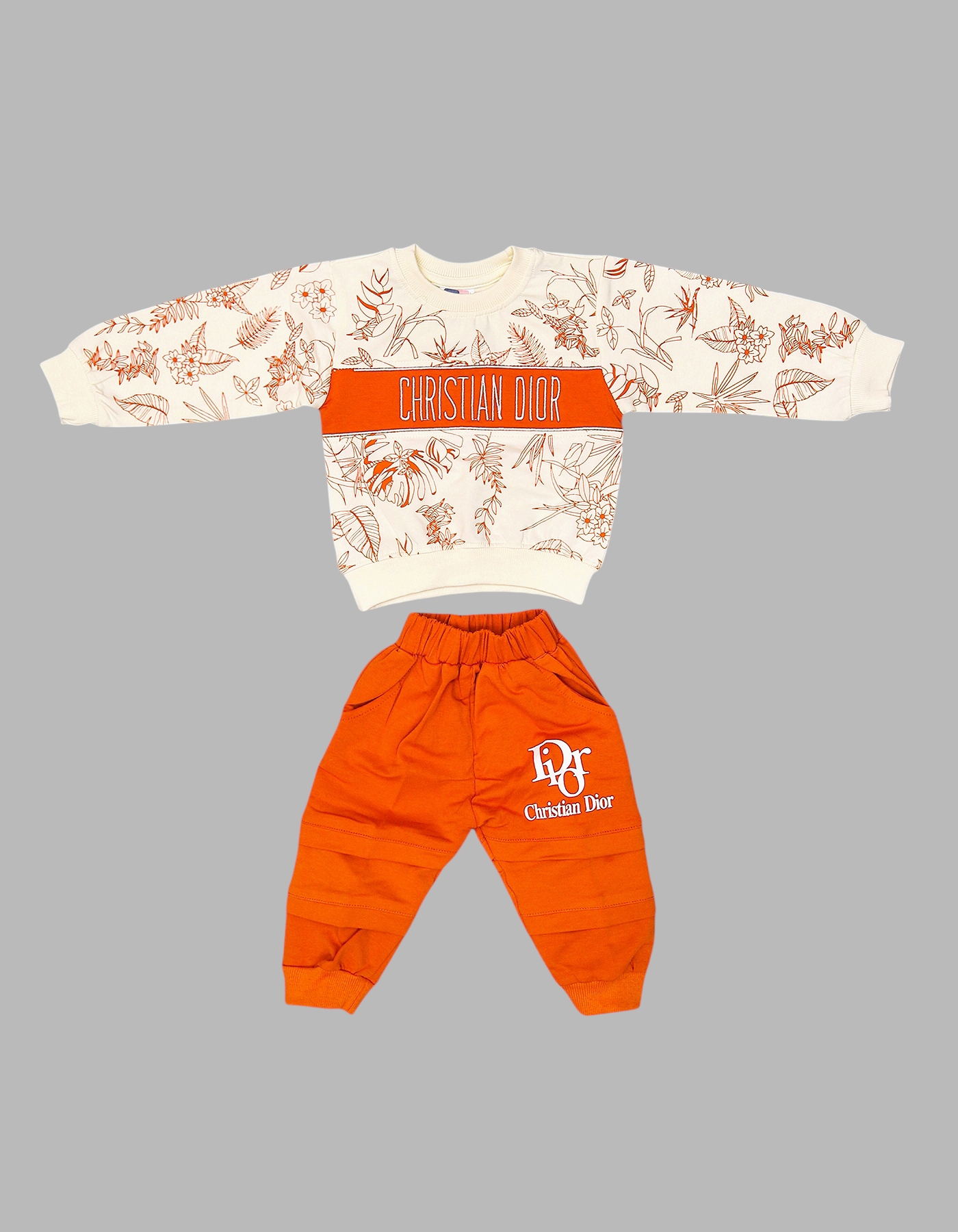 The Baby 2-Piece Designer-Inspired Outfit Set brings a stylish, luxury touch to your little ones wardrobe. Featuring a floral-patterned sweatshirt with bold Christian Dior print and matching jogger pants with logo detail, this set combines comfort and fashion. Made from soft cotton fabric, it ensures all-day coziness while keeping your baby trendy. Available in Blue, Green, Orange, and Yellow, its perfect for casual outings, playdates, or family photos.