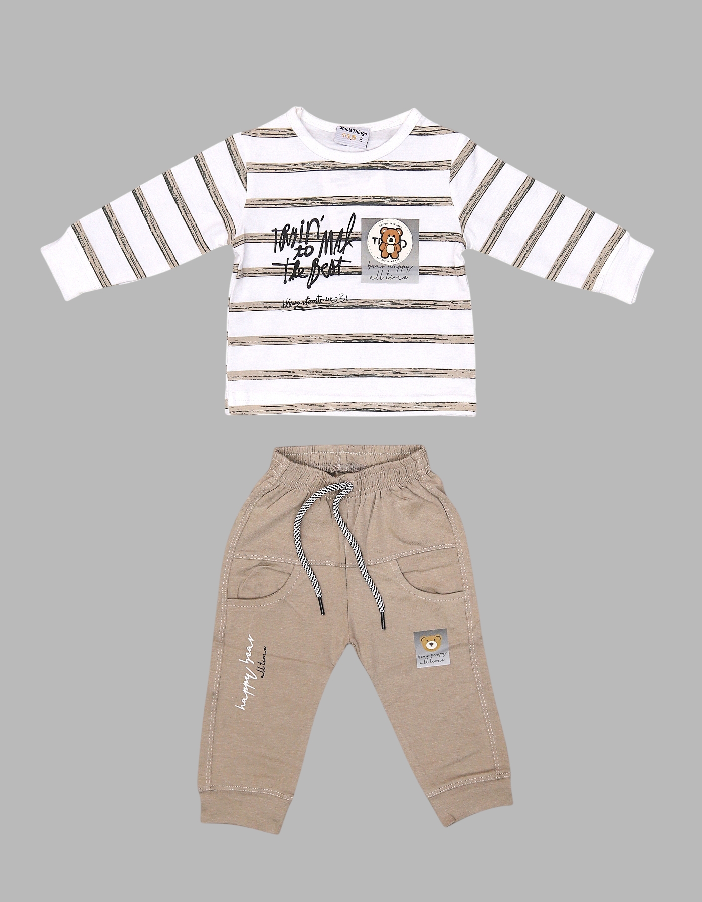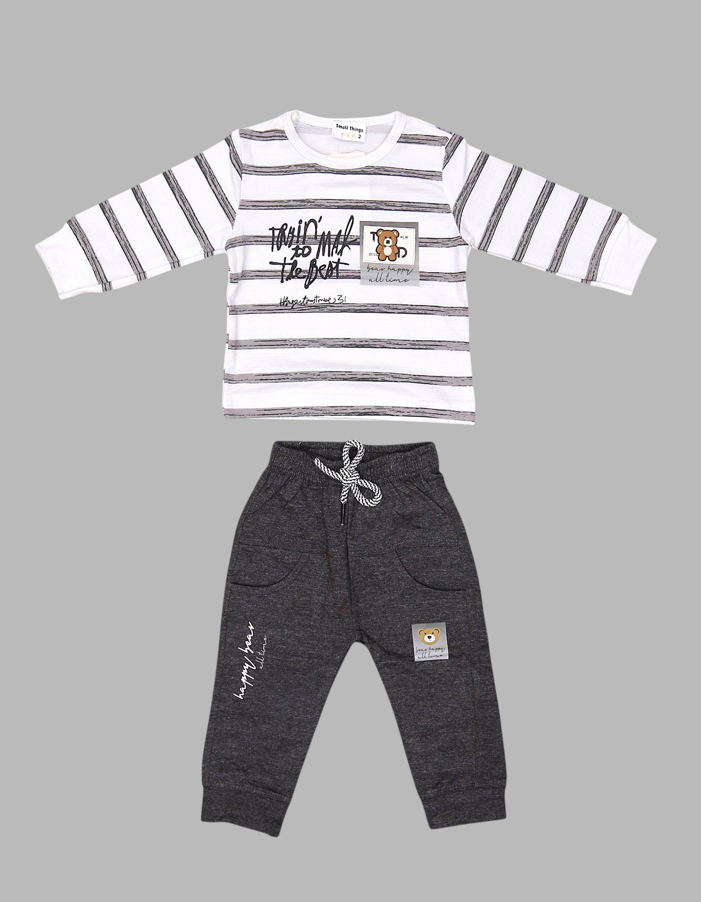 2-Piece Set: Striped top with teddy bear patch and jogger pants.