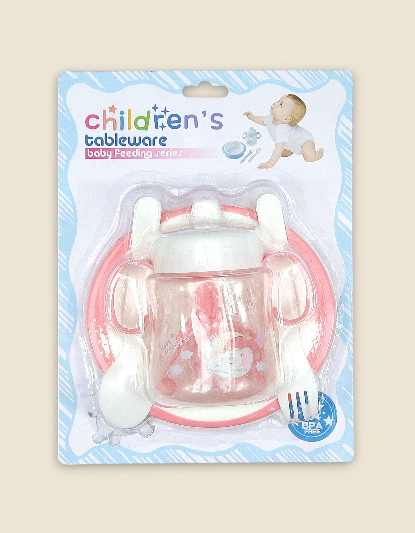 Complete BPA-free baby feeding kit with a dual-handle training cup, divided plate, spoon and fork. Designed for early self-feeding: lightweight, easy-grip handles, rounded utensil edges and playful pastel prints.