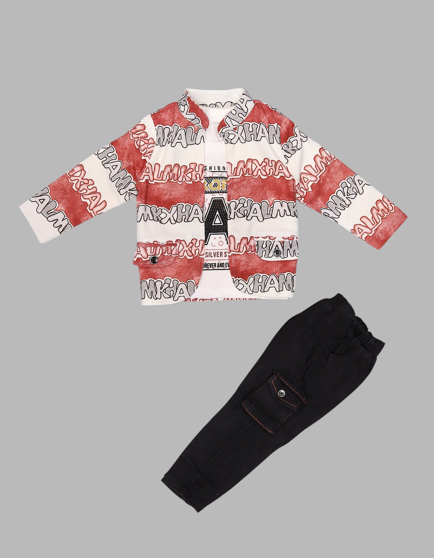 Three-piece kids outfit with an all-over printed jacket, white graphic tee and black cargo joggers. Bold horizontal print panels and flap pocket details on the jacket pair with easy elastic-waist joggers for a playful, camera-ready look.