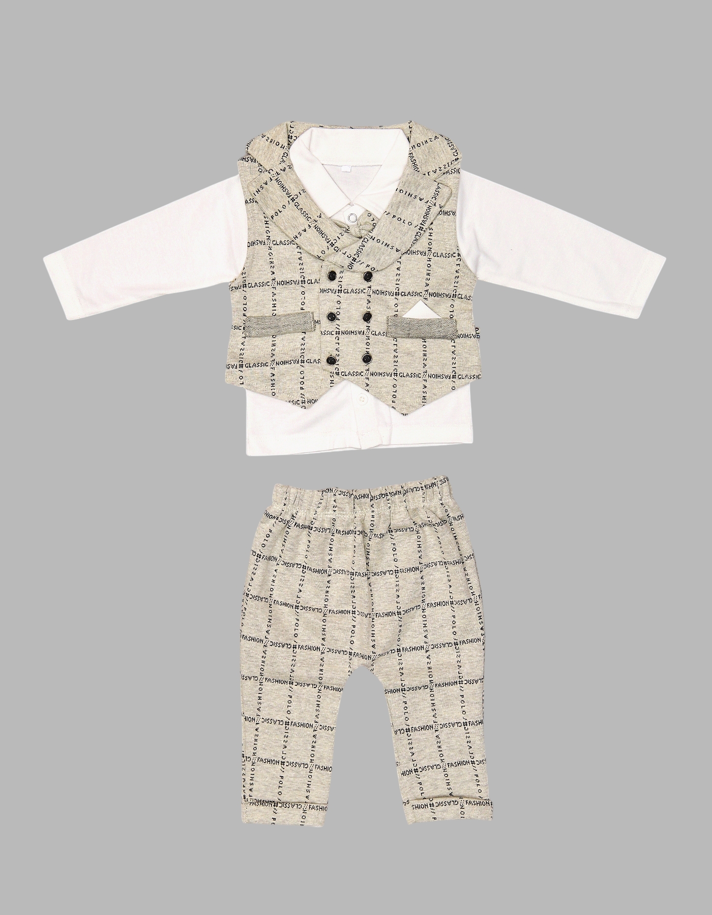 Dress your little one in charming style with the Baby 3-Piece Formal Gentleman Outfit Set. Perfect for special occasions, this outfit includes a classic white long-sleeve shirt, a checkered vest with bow tie, and matching pants. The soft cotton fabric ensures comfort, while the elegant design adds a touch of sophistication. Available in Brown, Green, and Grey, this set makes your baby look like a little gentleman at any event.
