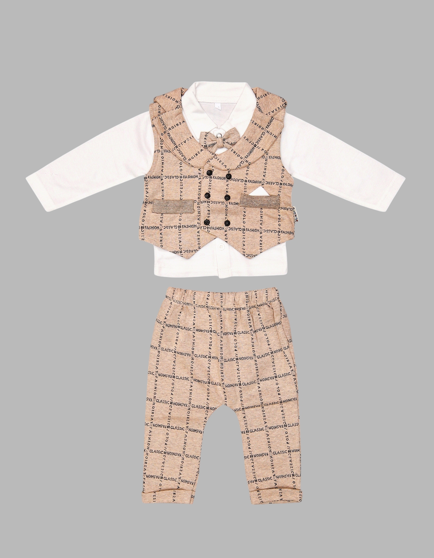 3-Piece Outfit Set: Includes long-sleeve white shirt, bow-tie vest, and matching pants.