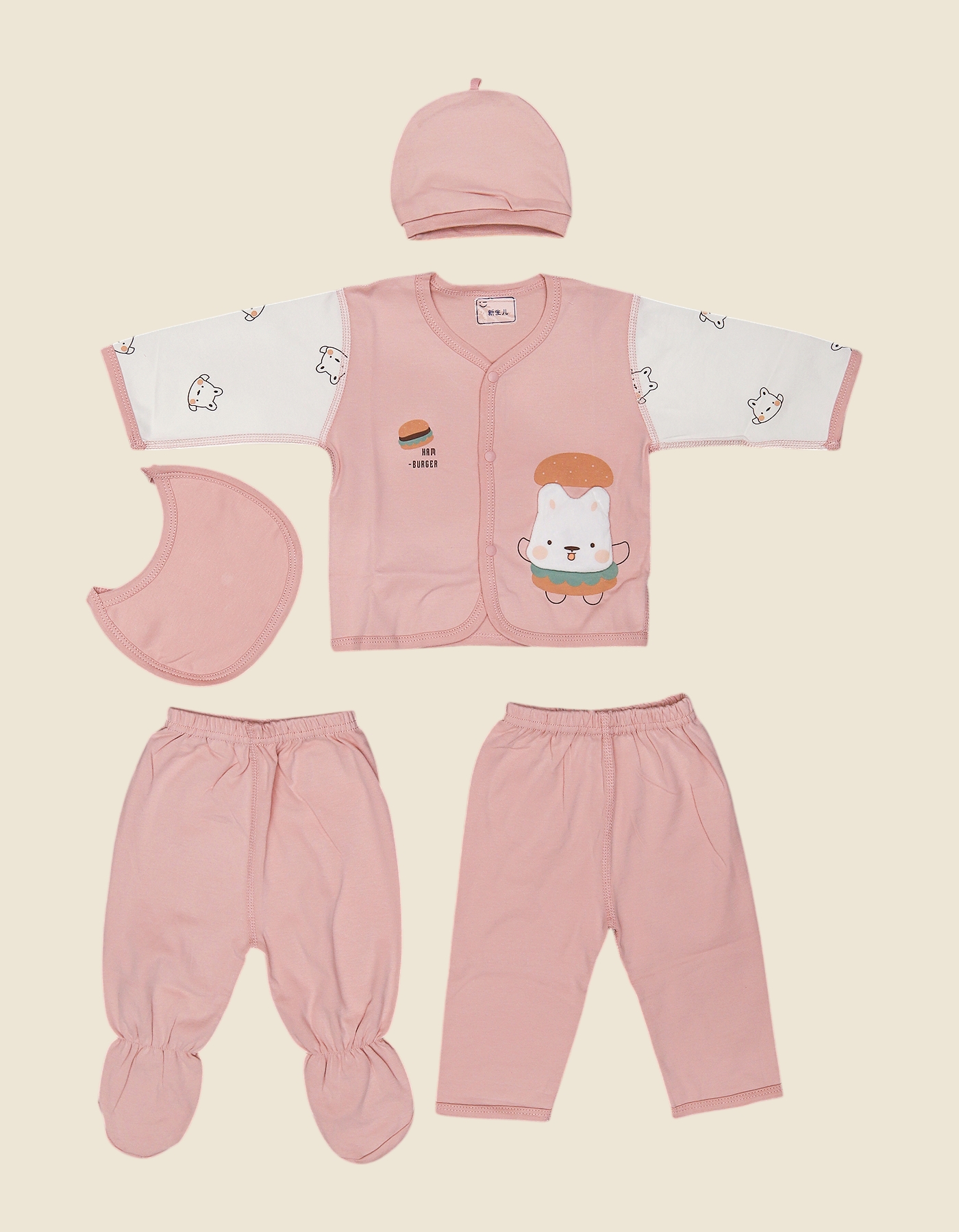 The Baby 5-Piece Soft Cotton Newborn Clothing Set in baby pink is designed to keep your little one cozy, comfortable, and stylish. Crafted from soft, breathable cotton, it ensures gentle care for delicate newborn skin. Featuring a playful burger-themed cartoon design with cute character prints on the sleeves, this set brings both fun and comfort to your babys daily wardrobe. Perfect for gifting or everyday wear, its a must-have newborn essential.