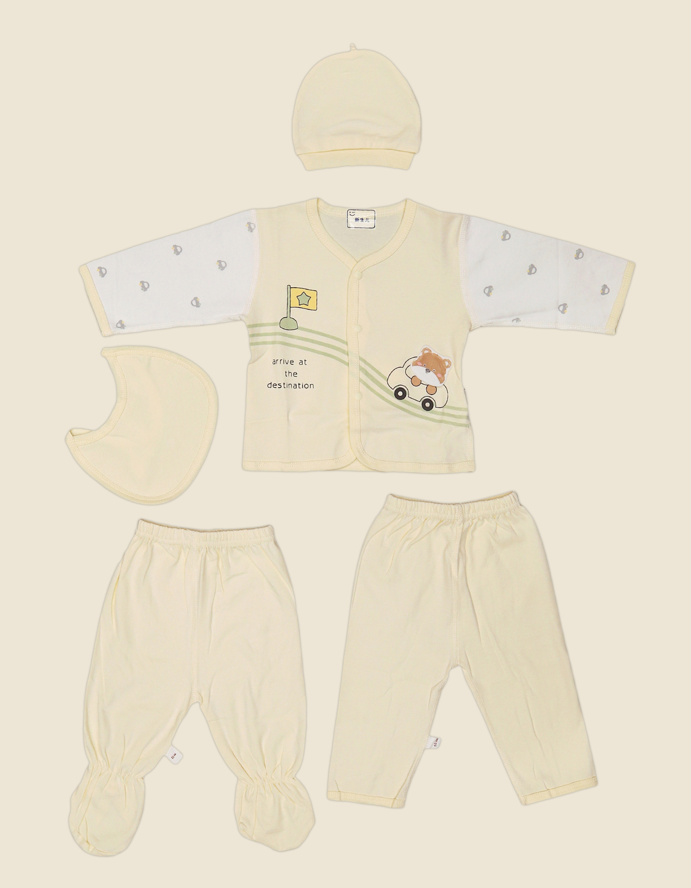 Complete 5-Piece Set: Includes a baby cap, bib, long-sleeve top, footed pants, and regular pants.