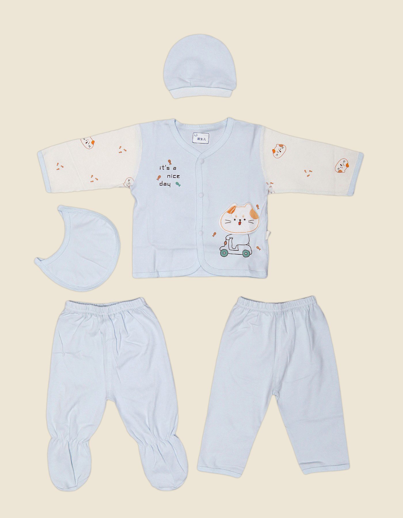 The Baby 5-Piece Soft Cotton Newborn Clothing Set in sky blue is designed to wrap your little one in comfort and cuteness. Made from ultra-soft, breathable cotton, this set is perfect for delicate newborn skin. With a charming kitten-on-scooter print and the words Its a nice day, it adds a cheerful touch to your babys wardrobe. A practical, adorable, and thoughtful choice for everyday wear or as a special gift for newborns.