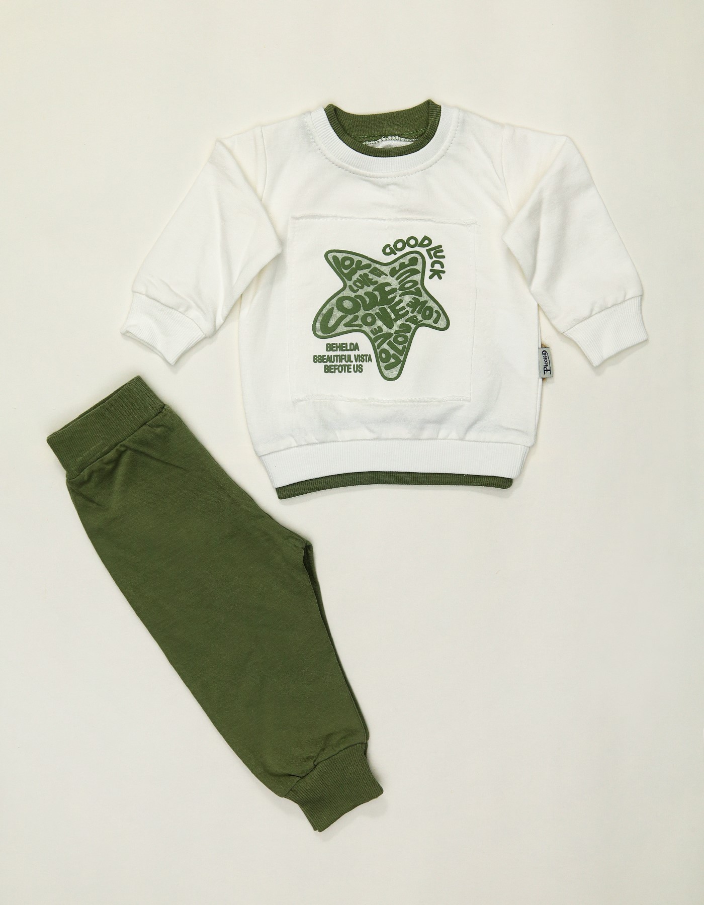 Comfortable 2-piece baby boy set made from soft blended fabric. Includes a white sweatshirt with a green star-shaped “Good Luck” graphic and matching army green jogger pants. Perfect for casual, everyday wear.