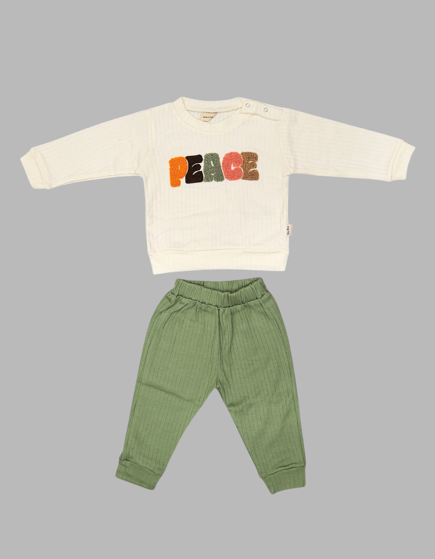 The Baby Cotton PEACE 2-Piece Ribbed Outfit Set brings comfort and style together for your little one. Featuring a ribbed texture design, this set includes a soft long sleeve sweatshirt with colorful PEACE embroidery and matching ribbed pants. Made from high quality cotton, it ensures breathability and a cozy fit, making it perfect for daily wear. Available in Green and Orange pants options, this outfit is a playful and trendy addition to your babys wardrobe.