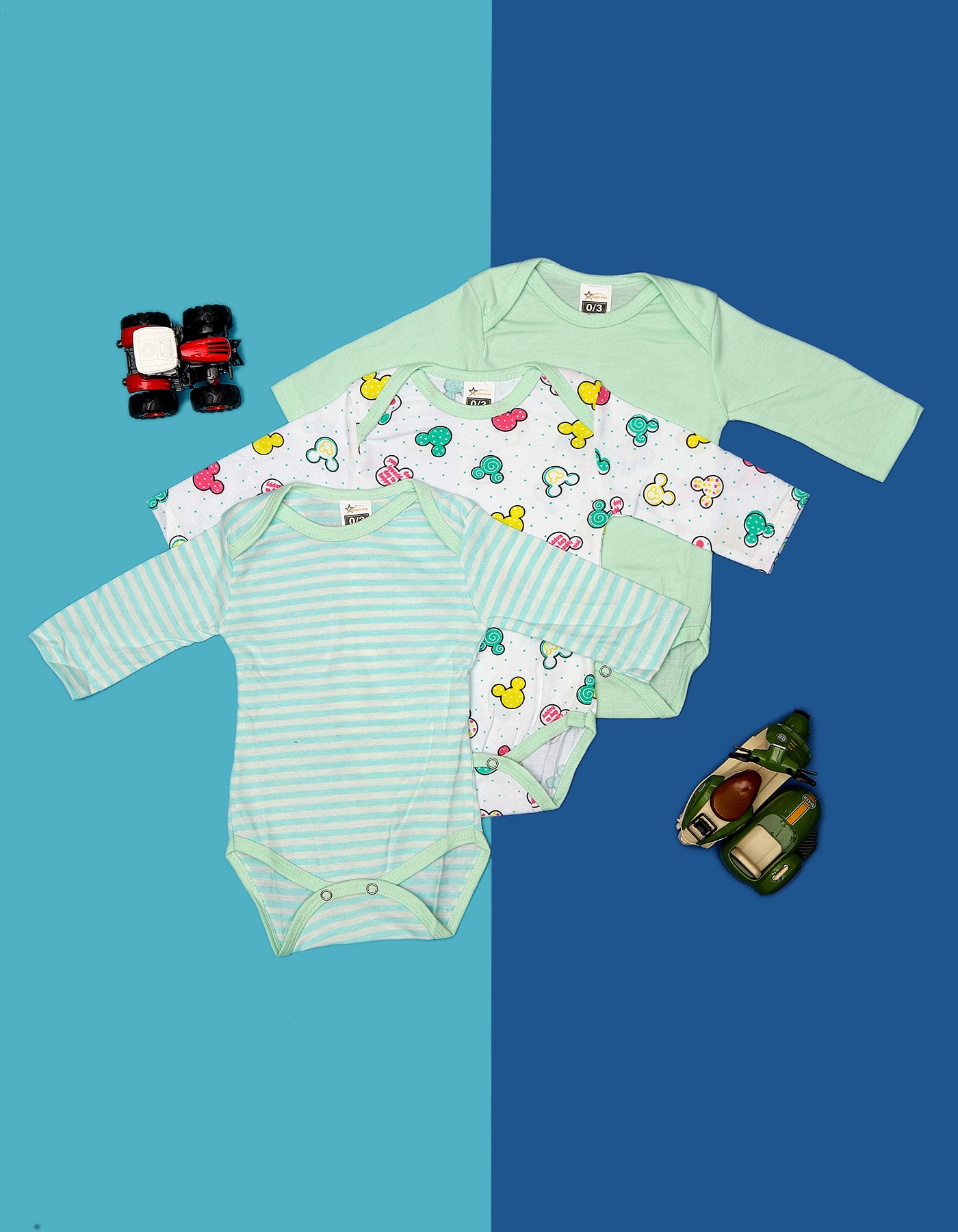 Detailed Features: Color & Print: Sea green tones with Mickey Mouse graphics Material: Comfortable cotton knit Fit: Gentle full-sleeved design Comfort: Ideal for all-day softness Purpose: Great for casual wear or layering Ideal For: Babies from newborns to toddlers What’s Included: 3 x bodysuits