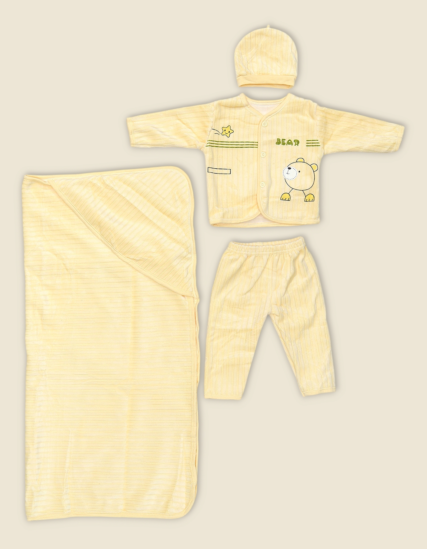 Cozy four-piece baby clothing set in cheerful yellow with bear print. Includes hooded jacket, pants, hat, and blanket. Soft fabric ensures comfort and warmth for newborns.
