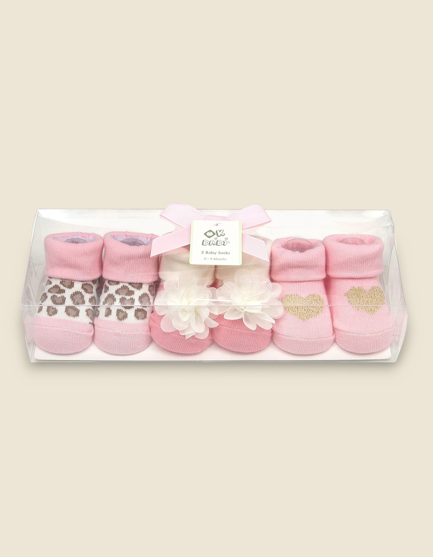 A set of three pairs of baby socks in soft pastel pink with playful patterns and floral accents. Fits newborn to 9 months. Perfect for gifting baby showers and everyday wear.