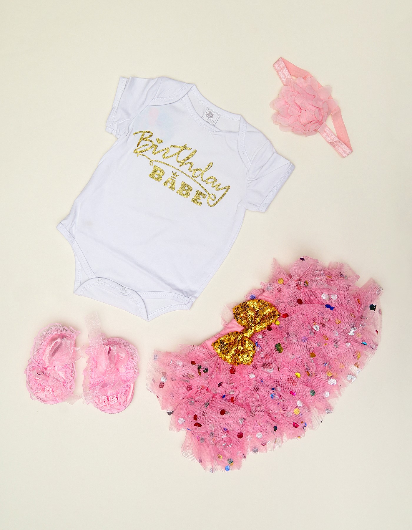 Celebrate your little one’s special day with this adorable birthday outfit. The set includes a soft white bodysuit with golden "Birthday Babe" print, a frilly pink tutu skirt with a sparkling golden bow, matching floral headband, and lace shoes. Designed for comfort and cuteness, this outfit is perfect for birthdays, photoshoots, and parties.