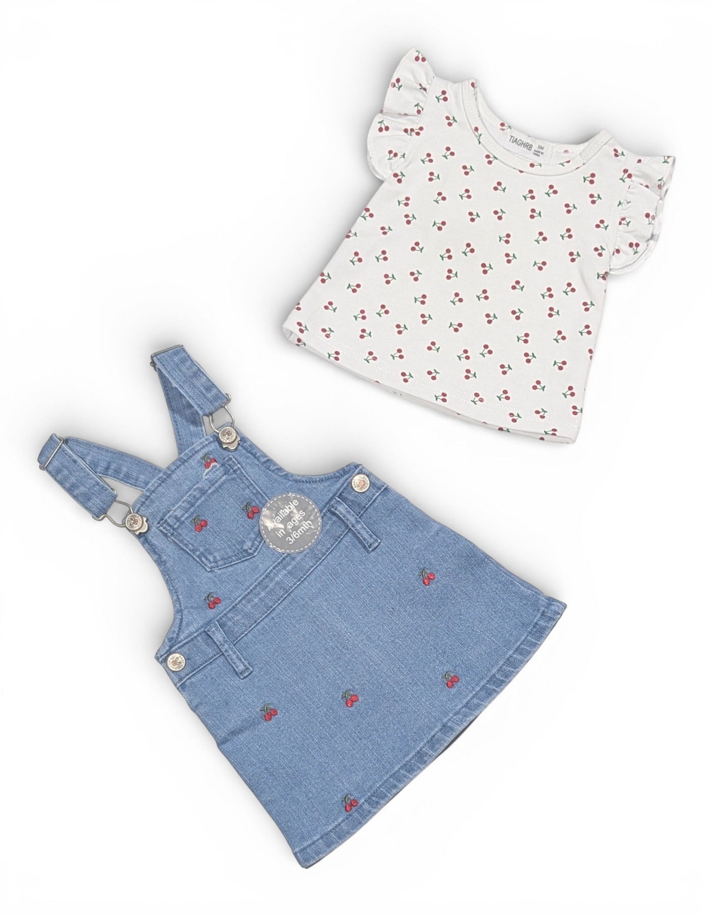 2-piece set: Cherry print top + denim pinafore dress