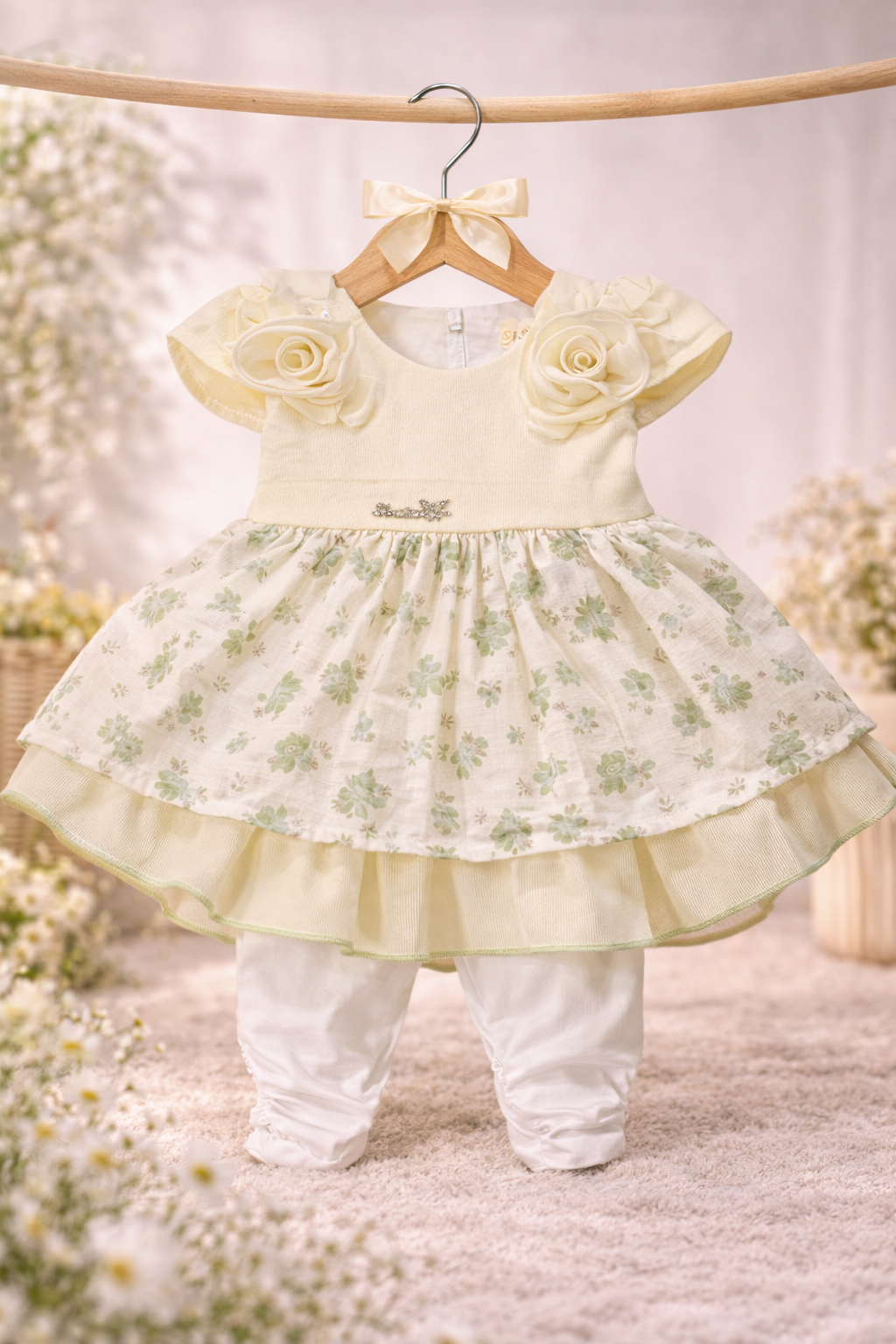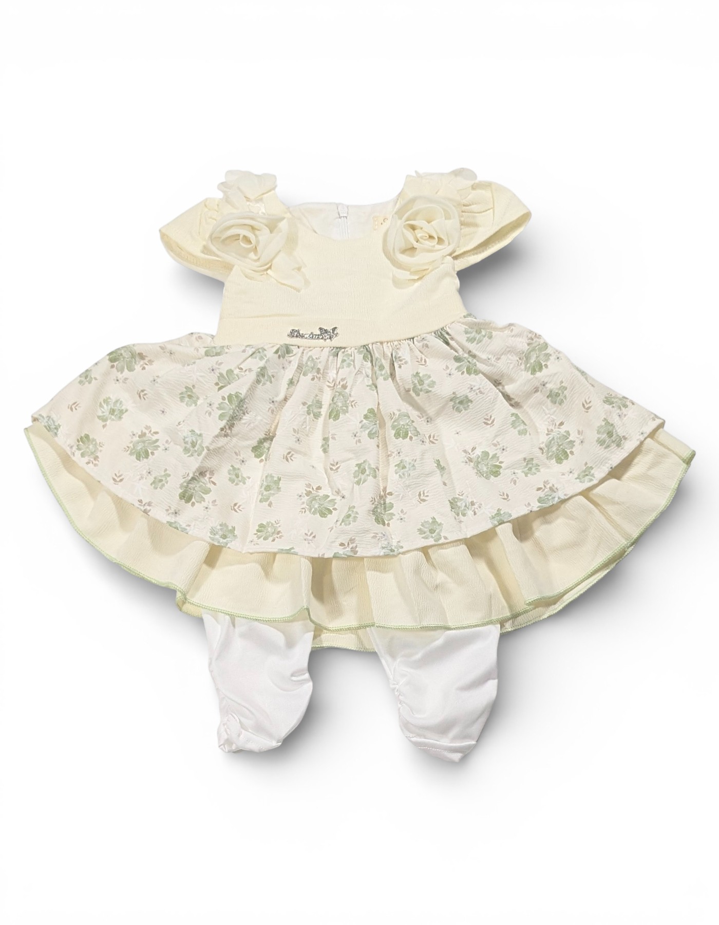 Dress your little princess in timeless elegance with this beautiful cream floral layered frock set. Designed for special occasions and memorable moments, this charming outfit features a soft cream bodice adorned with delicate rose appliqués on the shoulders, adding a graceful and luxurious touch. The layered skirt showcases a subtle green floral print over a flowing ruffle hem, creating a voluminous and stylish silhouette. Paired with comfortable matching leggings, this set ensures your baby girl stays cozy while looking adorable. The soft, breathable fabric is gentle on delicate skin, making it perfect for parties, family gatherings, birthdays, and festive celebrations.