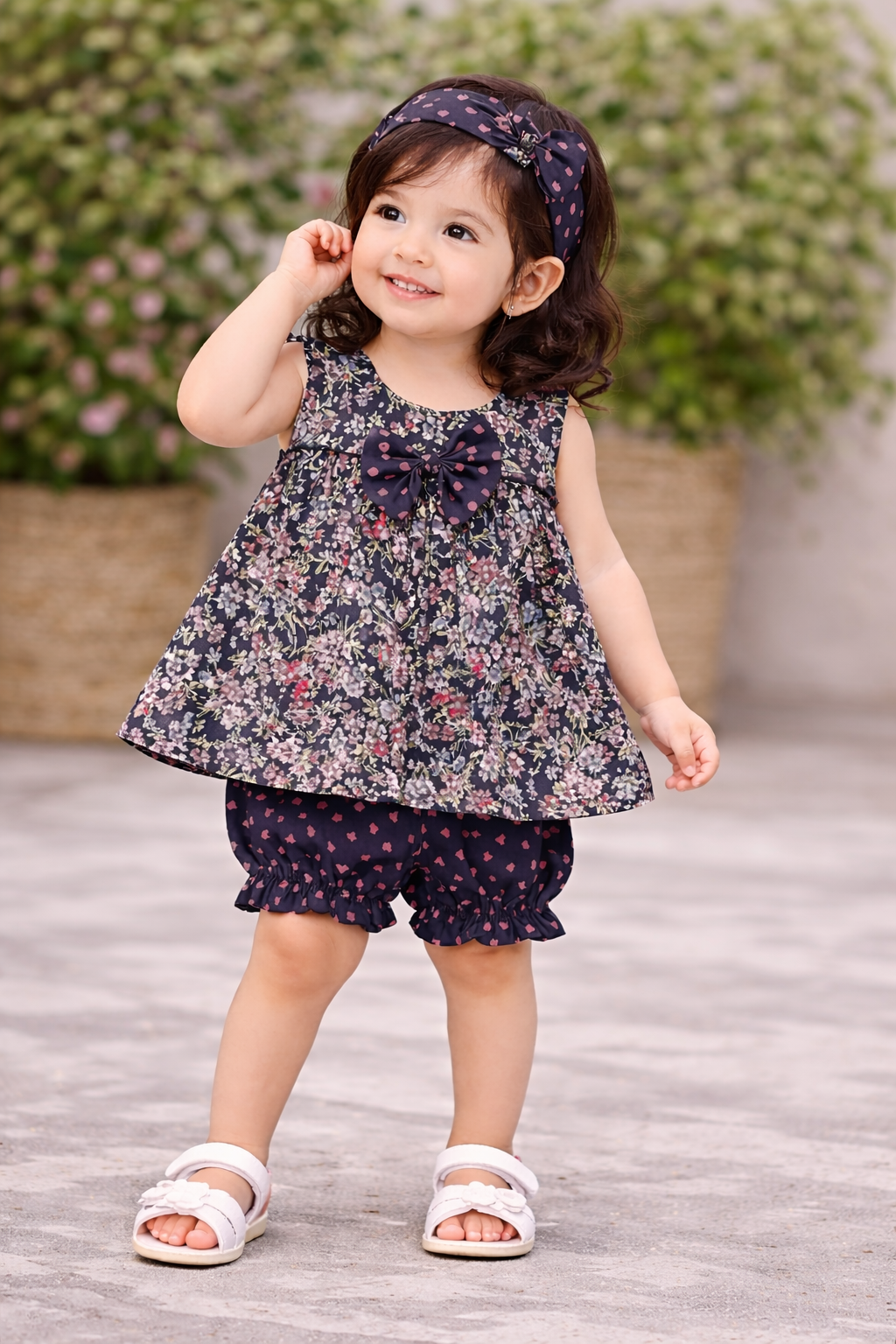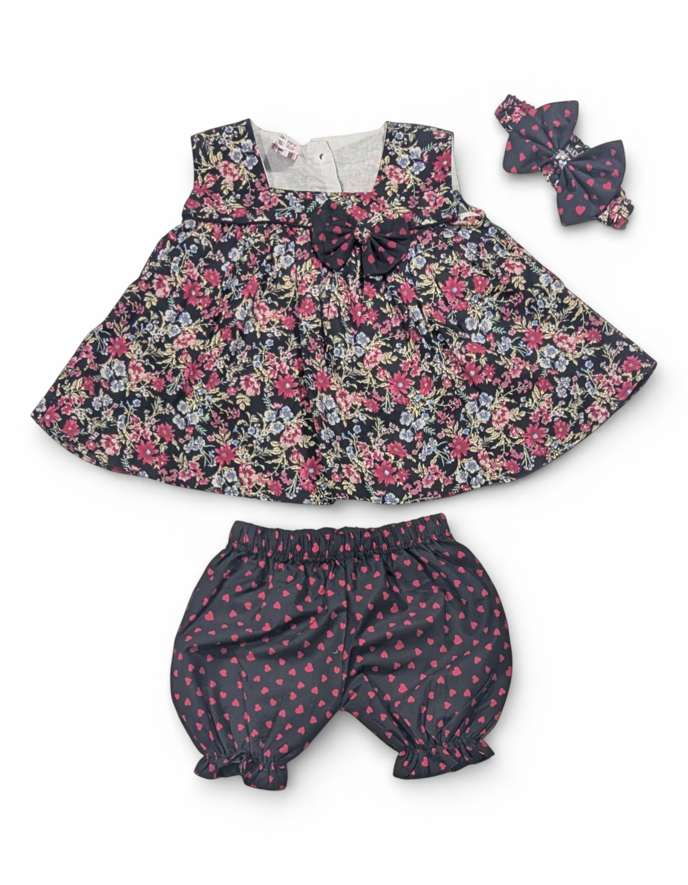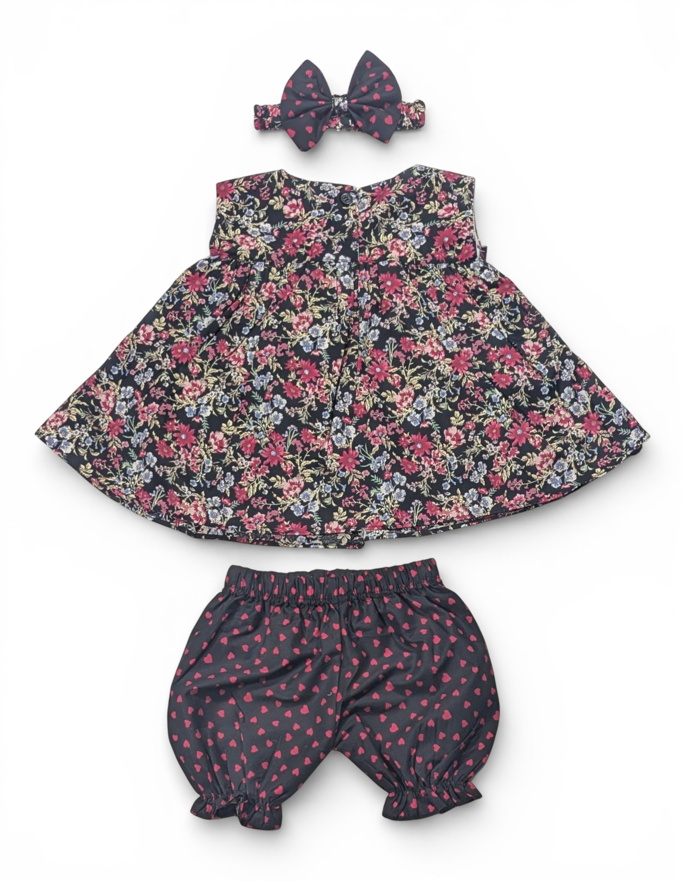 Dress your little princess in timeless charm with this adorable Girl’s Cotton Frock Set, designed for both comfort and cuteness. Featuring a beautiful all-over floral print on a soft dark base, this sleeveless frock is highlighted with a stylish bow detail at the neckline for an extra touch of elegance. The set includes matching heart-print bloomers and a coordinating headband, creating a perfectly styled outfit for any occasion. Made from breathable, soft cotton fabric, it keeps your baby comfortable all day long while allowing easy movement for playtime and special moments alike. Perfect for birthday parties, family gatherings, outings, or casual wear, this outfit blends style and comfort effortlessly.