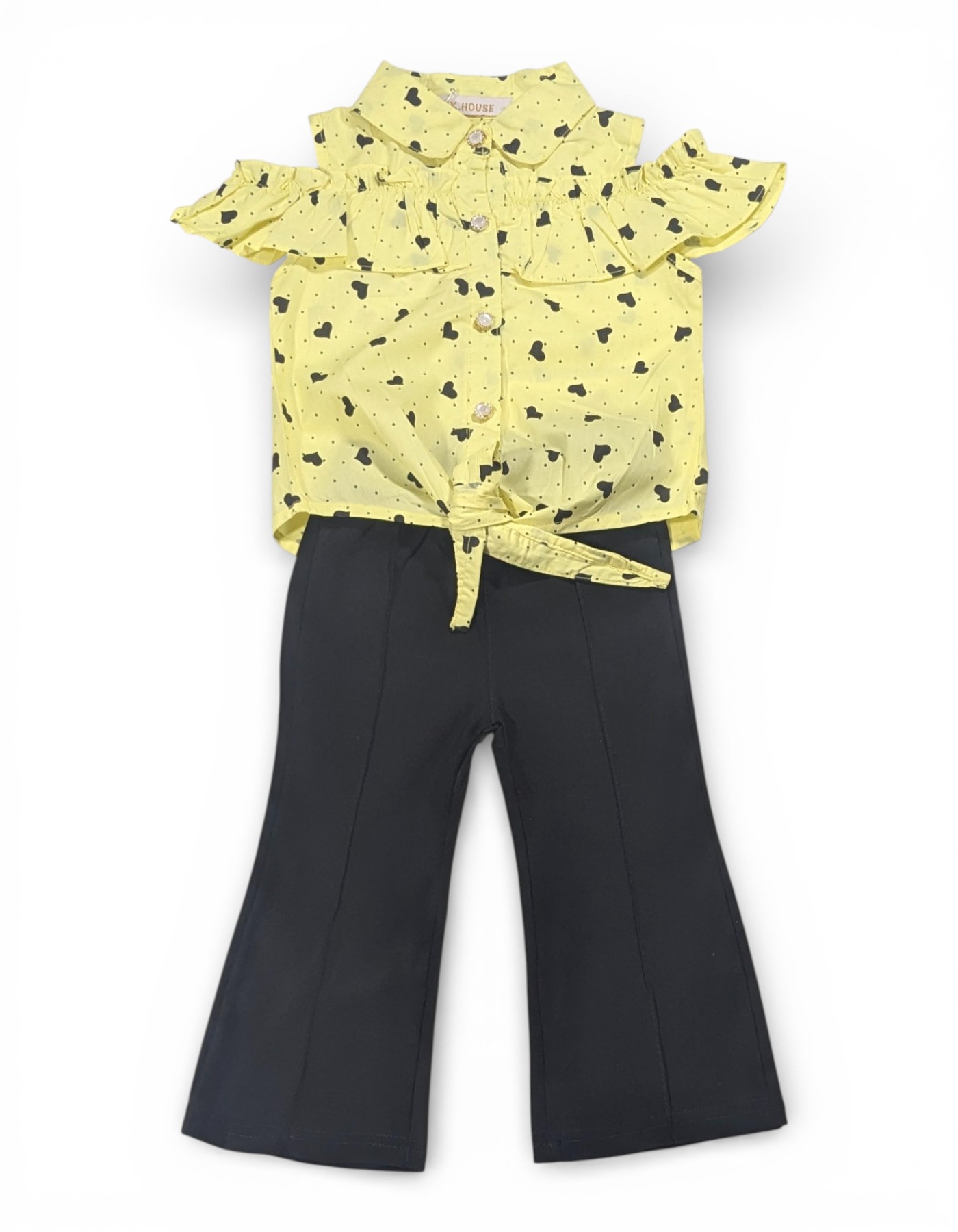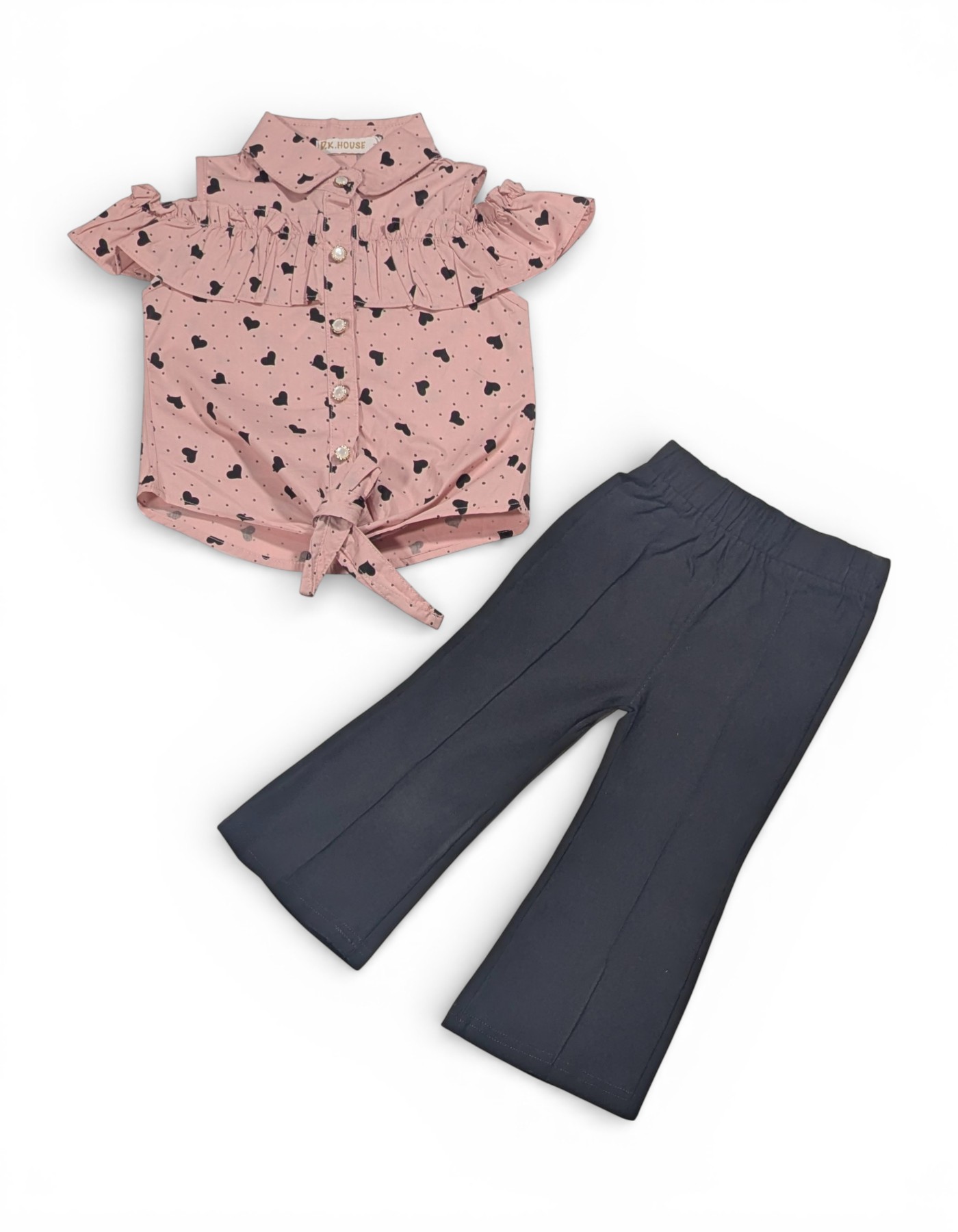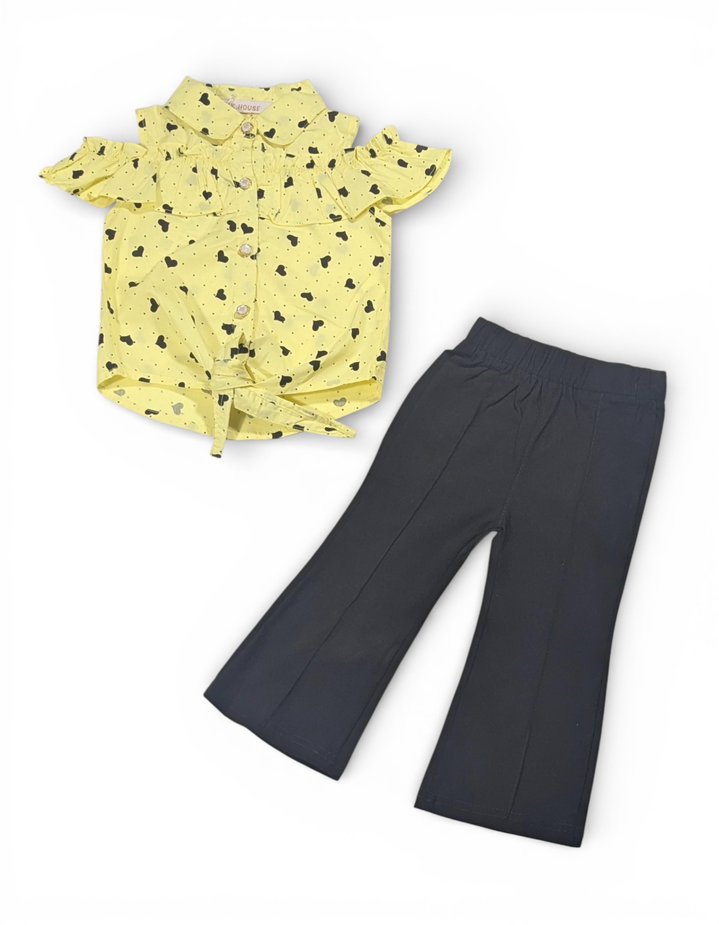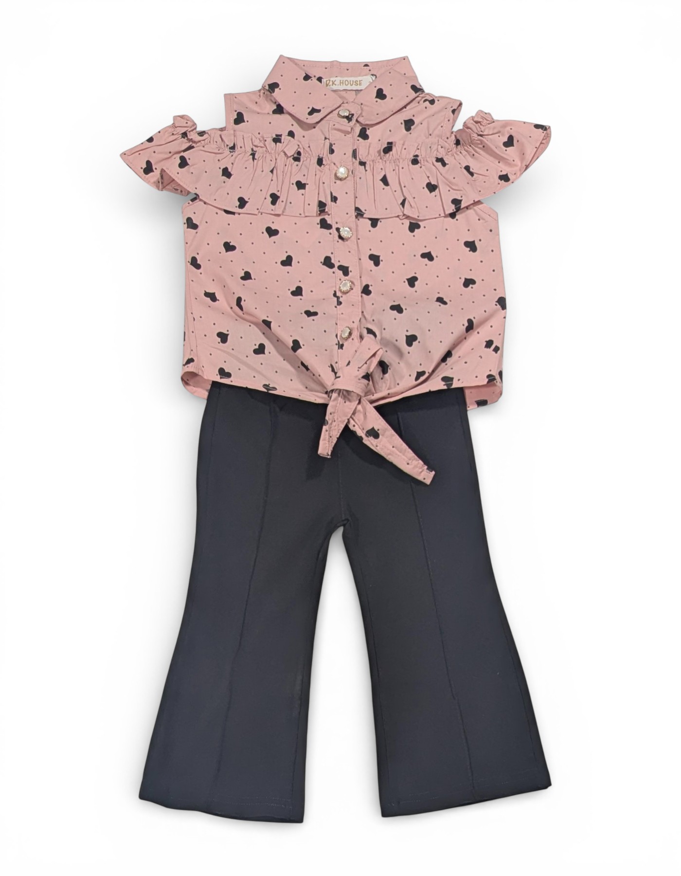 Make your little fashionista shine in this Baby Girl Heart Print Cotton Suit Set, designed for both comfort and style. This adorable 2-piece outfit includes a trendy heart-print cotton top paired with classic black flared pants—perfect for everyday outings and special occasions alike. The soft cotton top features an all-over heart print, a smart collar neckline, and delicate ruffle detailing across the front for a cute, stylish touch. The front button closure and charming front tie-knot design add extra flair while ensuring easy wear. Paired with comfortable black flared pants featuring an elastic waistband, this set offers a fashionable silhouette with all-day comfort.