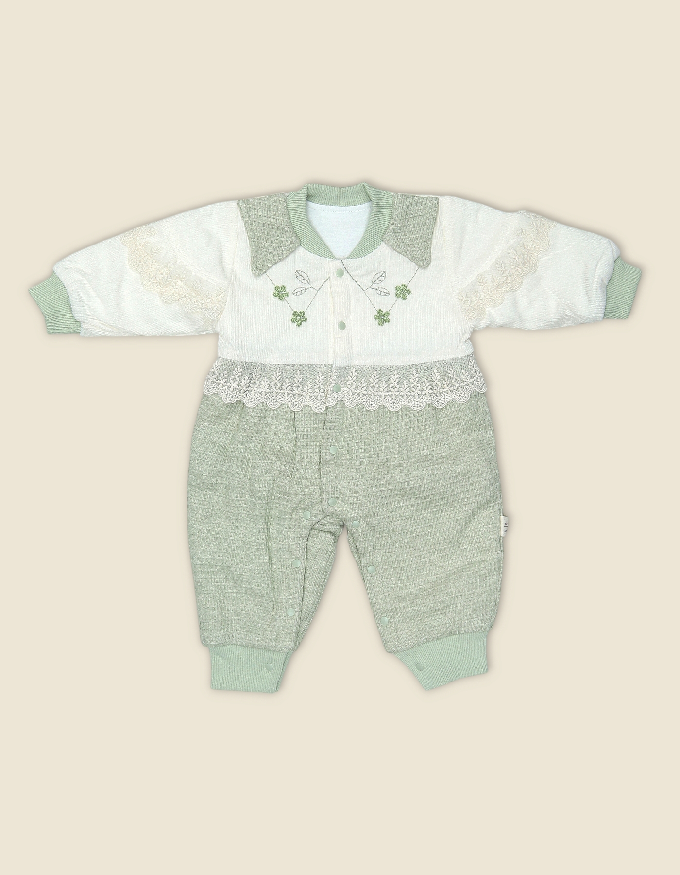 Charming baby romper featuring a white top with floral embroidery, lace details, and a textured green bottom. Designed with snap buttons for easy dressing and diaper changes.