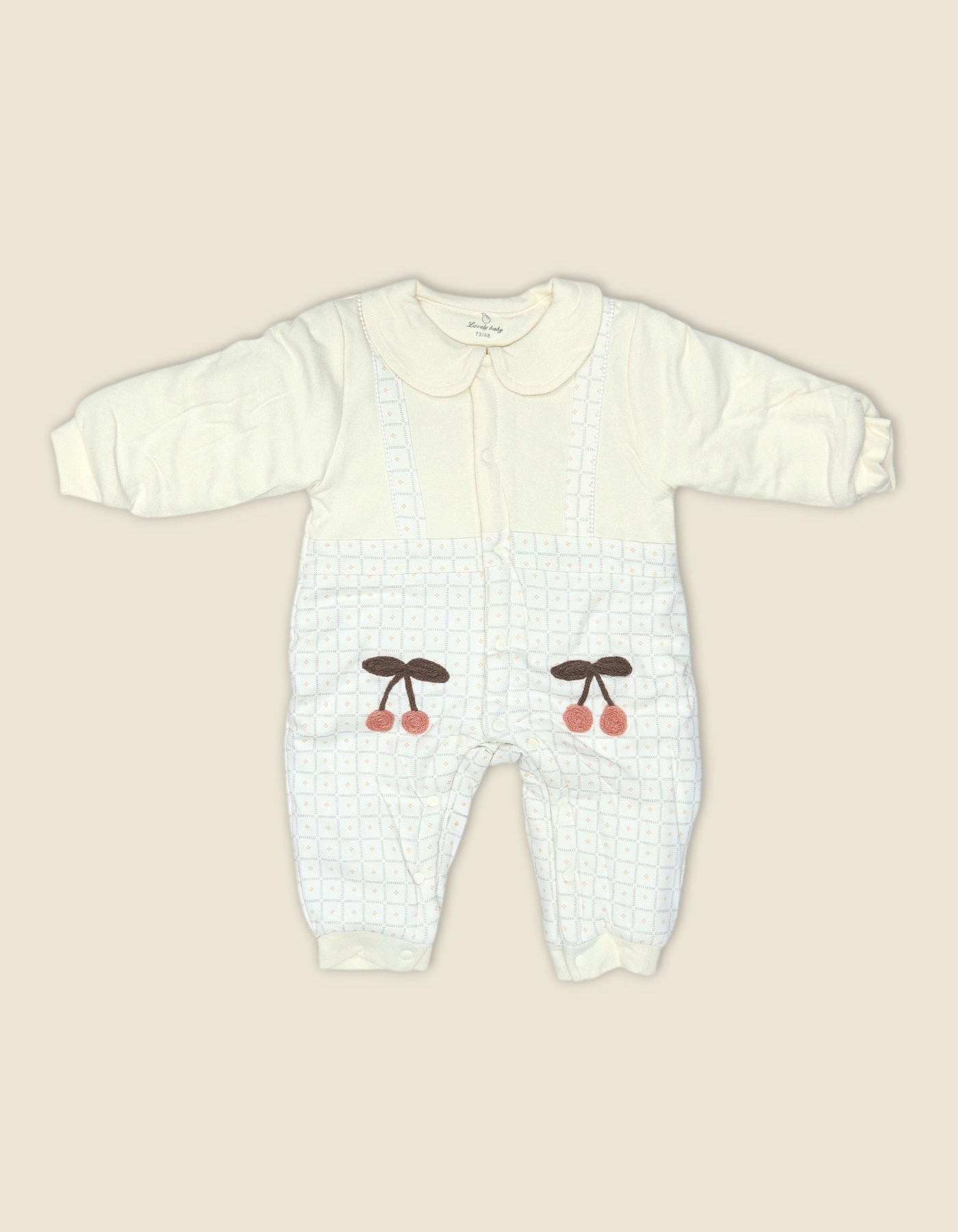 Adorable baby romper designed with a white top, blue grid patterned bottom, and cherry appliqués. Features a Peter Pan collar and snap button closure for easy dressing.