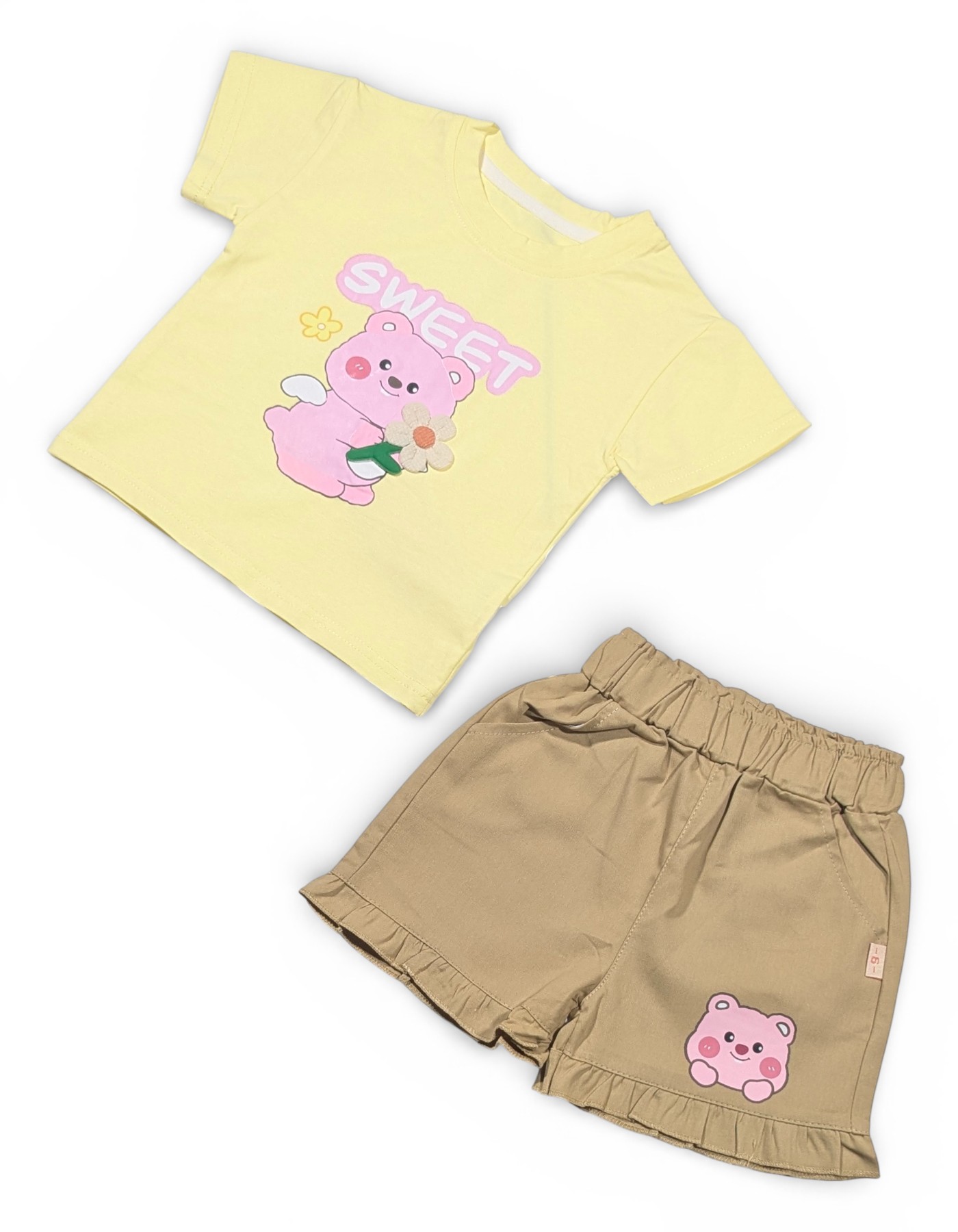 Add a dose of cuteness to your little one’s wardrobe with this Baby Girl “Sweet” Cartoon Print Top & Ruffle Shorts Set — a playful and comfy outfit perfect for everyday fun.