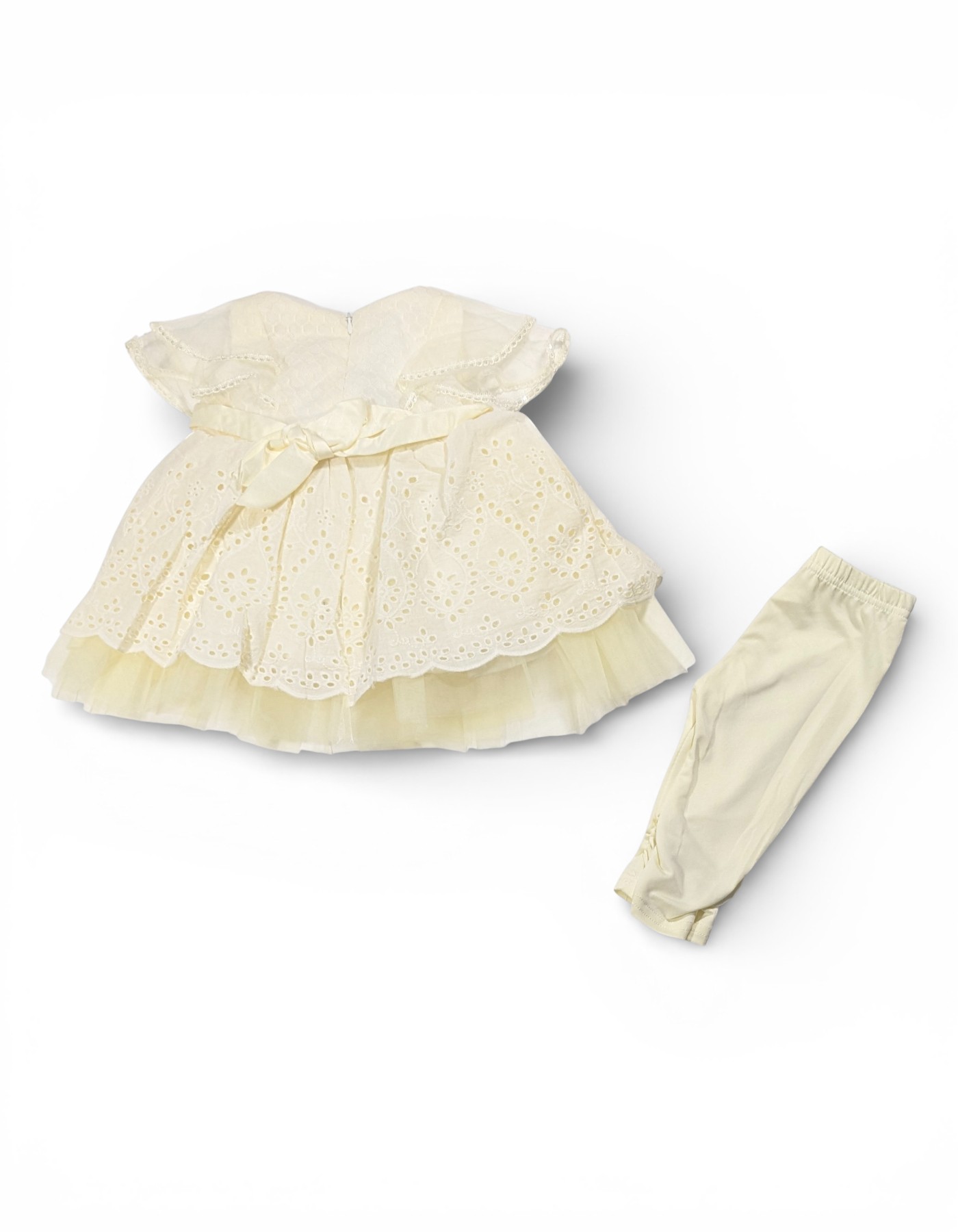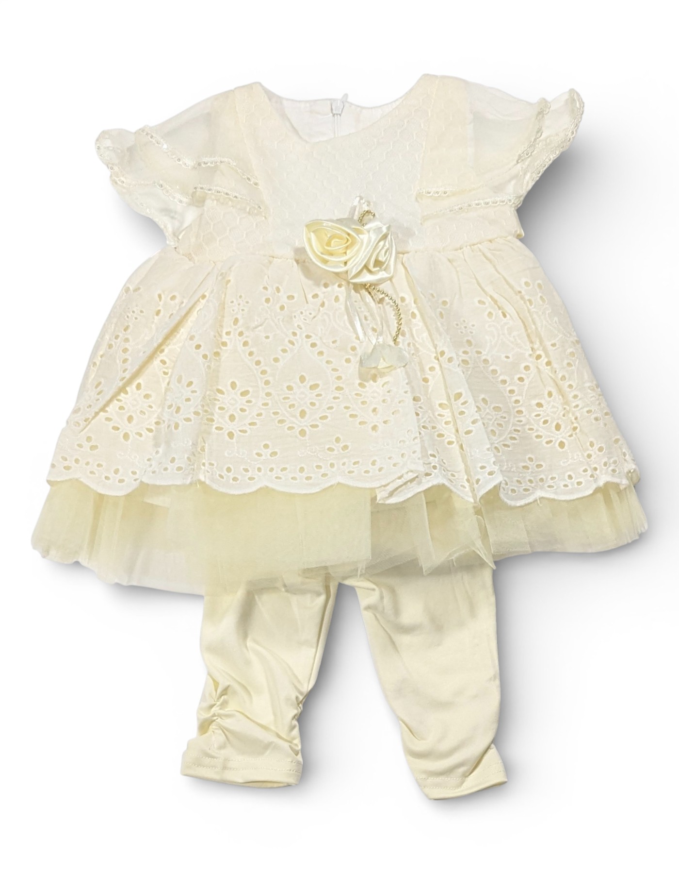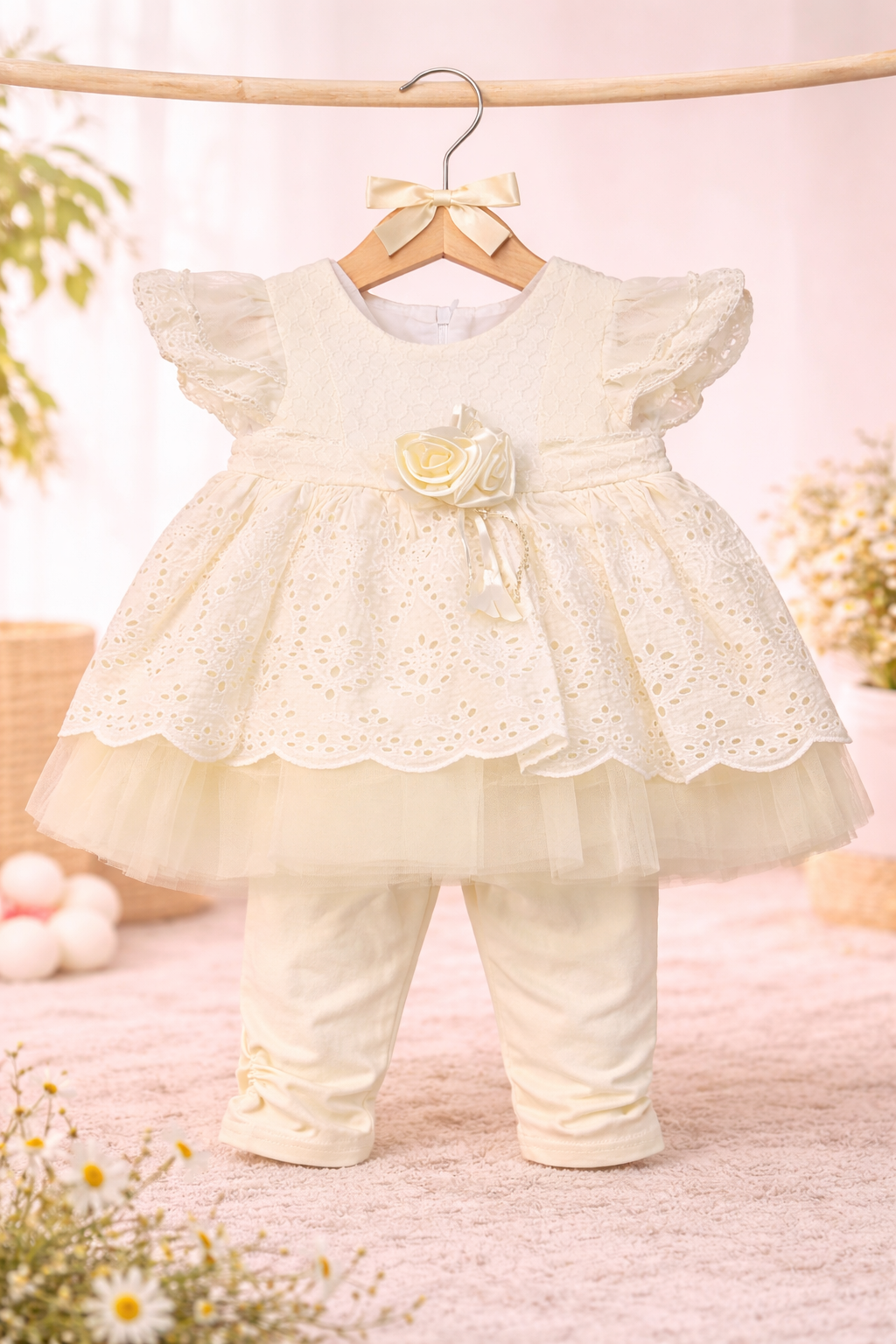 Dress your little princess in timeless elegance with this beautiful cream lace frock set. Designed with delicate detailing and a charming silhouette, this outfit is perfect for special occasions, celebrations, and memorable photo moments. The frock features a soft textured bodice with flutter sleeves and a layered lace skirt adorned with intricate eyelet embroidery. A lovely floral applique with subtle decorative accents at the waist adds a graceful finishing touch. The inner lining ensures comfort, while the lightweight fabric keeps your baby feeling soft and breathable throughout the day. Paired with matching stretchable leggings, this set offers both style and comfort, allowing easy movement for your little one.