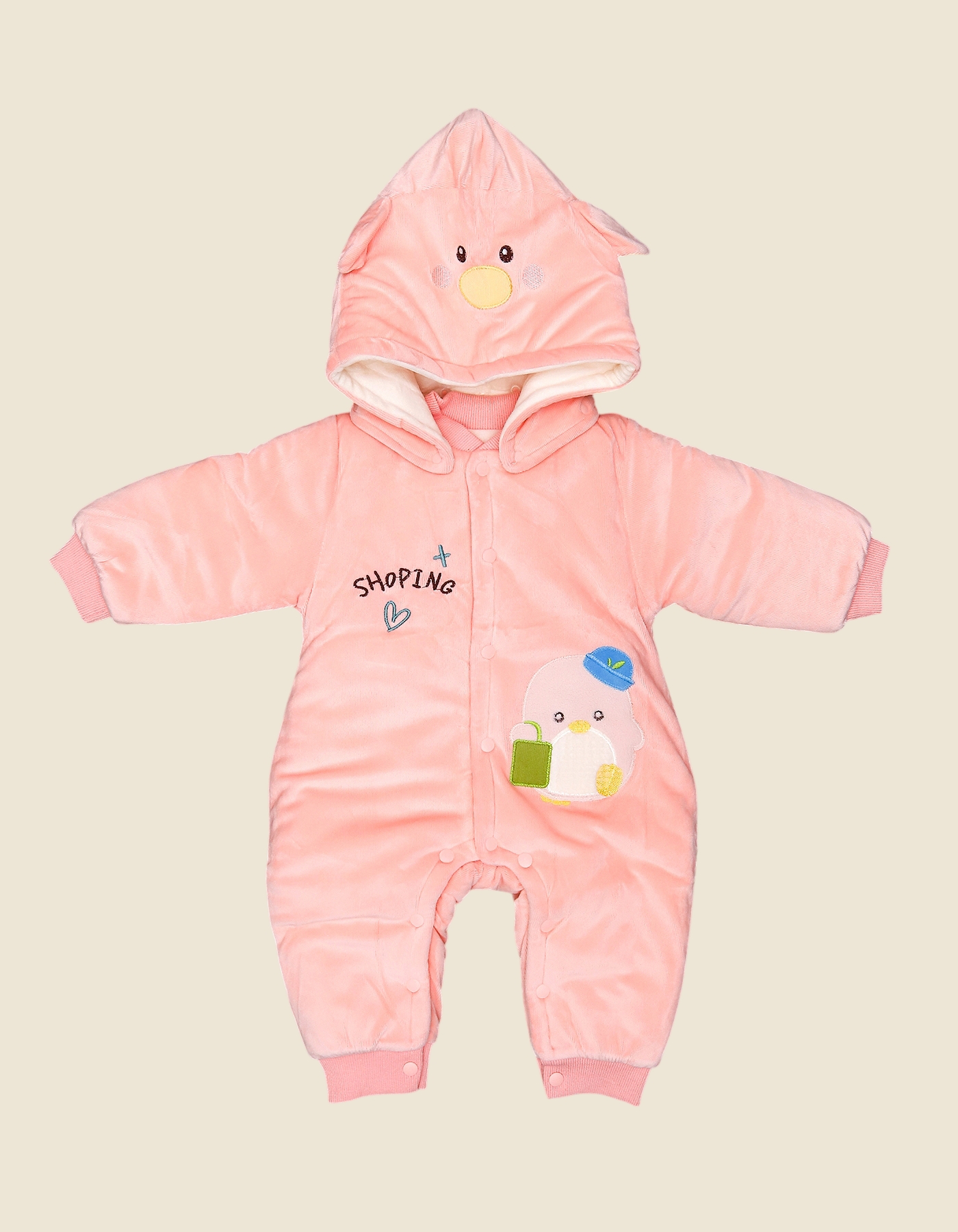 Keep your baby warm, cozy, and adorable with the Baby Penguin Quilt Romper. Made with soft quilted fabric, this romper features a hood with a cute penguin face, long sleeves, ribbed cuffs, and snap-button closure for easy dressing. The embroidered penguin holding a shopping bag adds a playful touch, while the baby pink color makes it extra charming. Perfect for cold weather, outings, or as a delightful baby gift.