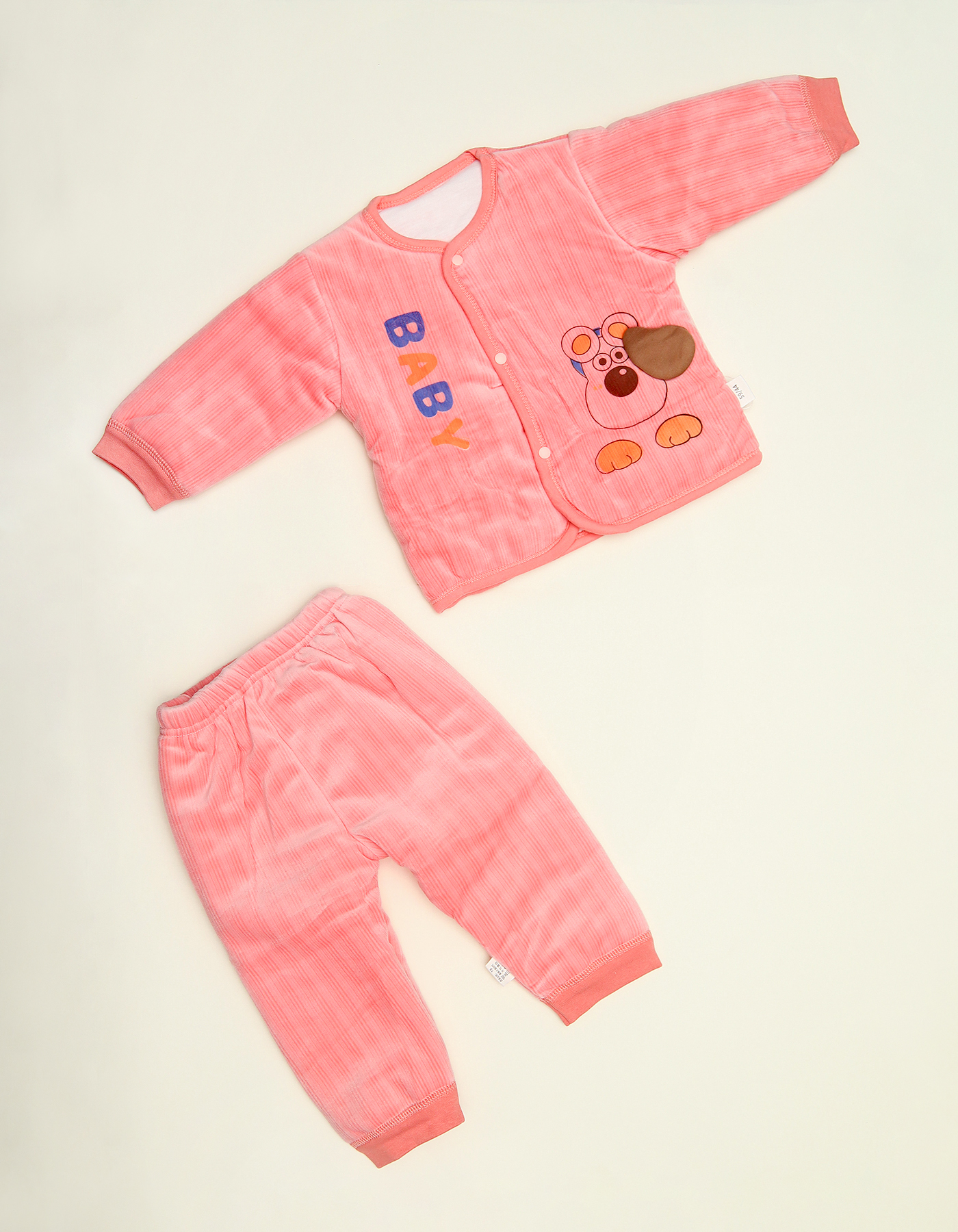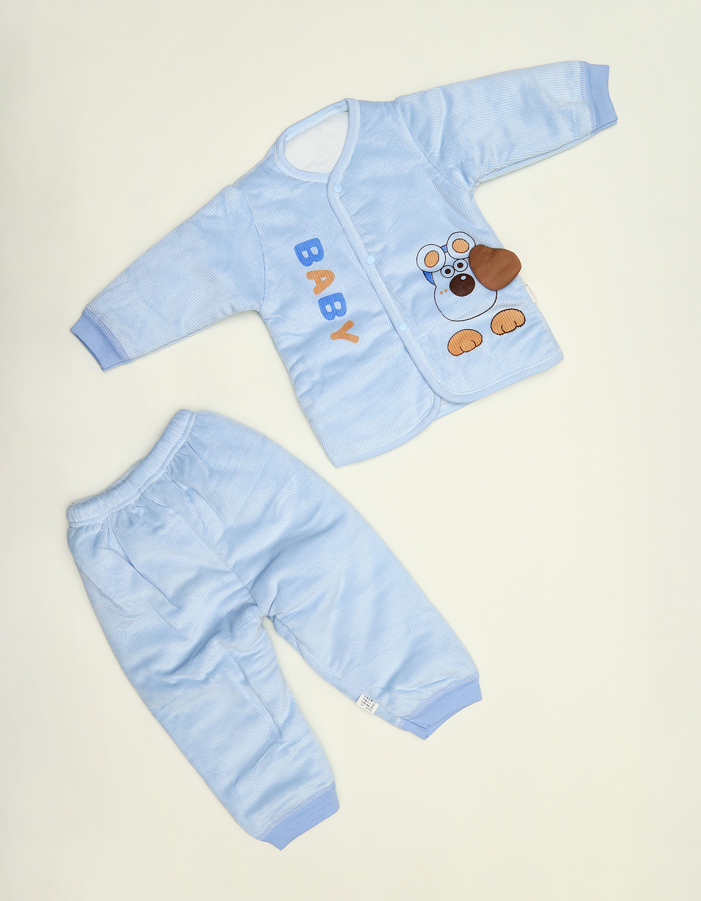 Warm quilted baby suit available in Carrot, Sky Blue, and Yellow. Includes a buttoned jacket with dog print and matching pants. Perfect for colder days.