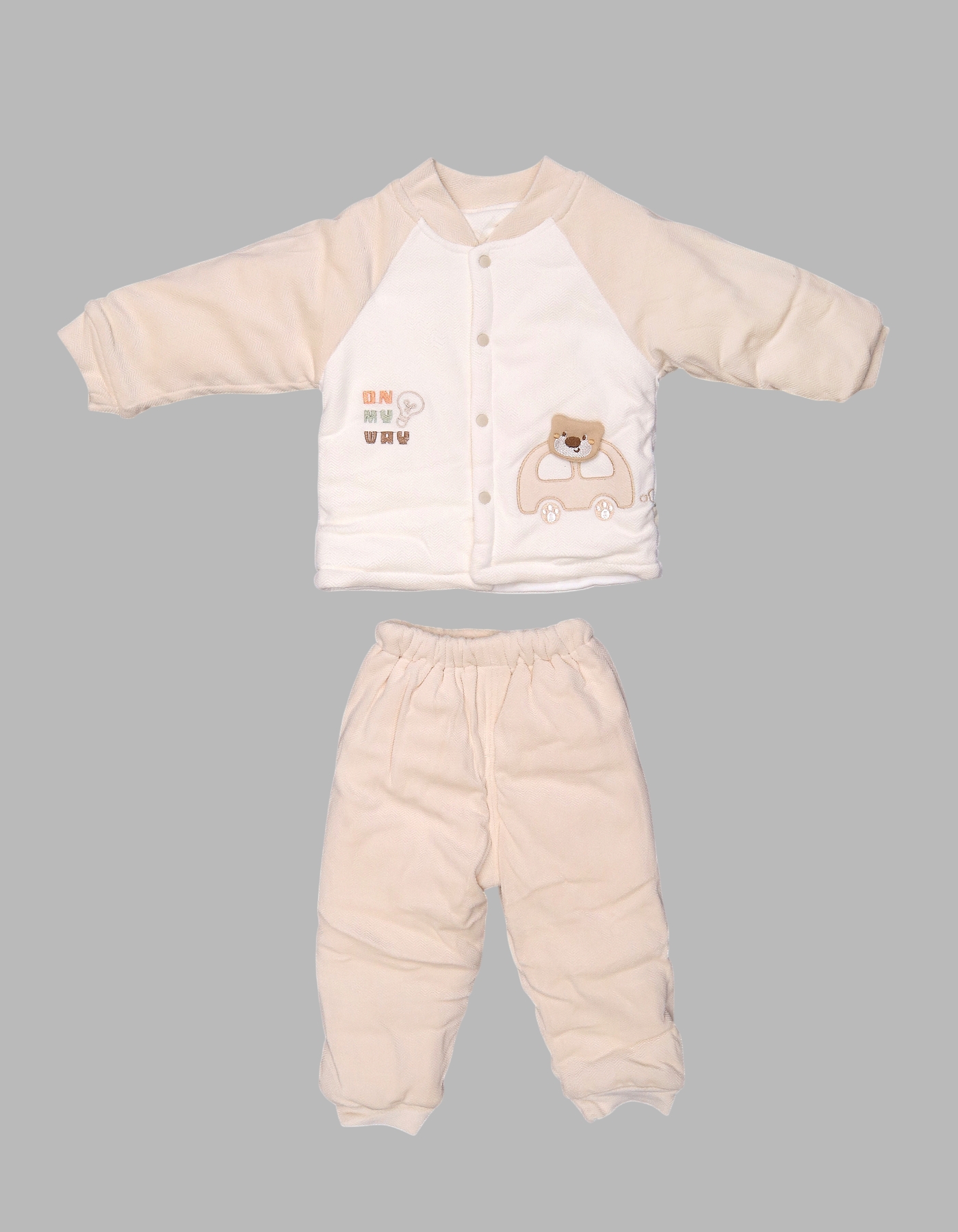 The Baby Quilt Suit is a cozy and warm outfit designed for infants and toddlers, perfect for colder days. Crafted from soft quilted fabric, it provides both comfort and insulation, ensuring your little one stays snug throughout the day. The adorable teddy bear in a car embroidery with On My Way text adds a charming touch, making it not only practical but also stylish. This two-piece set includes a front-button quilted jacket and matching quilted pants with an elastic waistband for easy dressing and a secure fit.