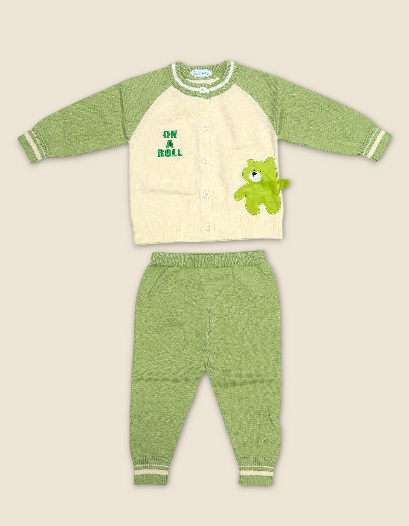 Adorable baby suit with bear applique and ON A ROLL embroidery. Perfect for daily wear and gifting