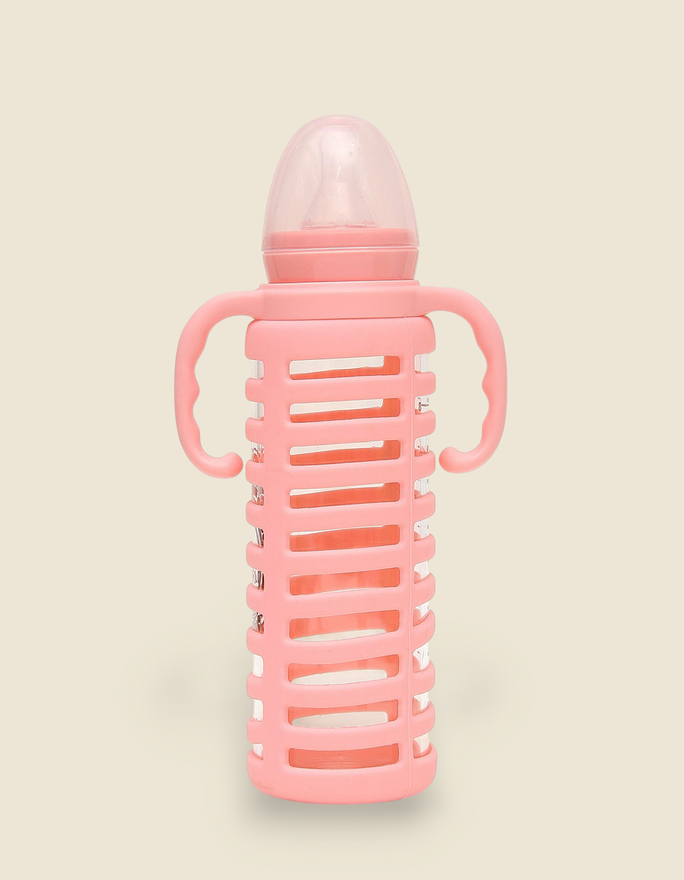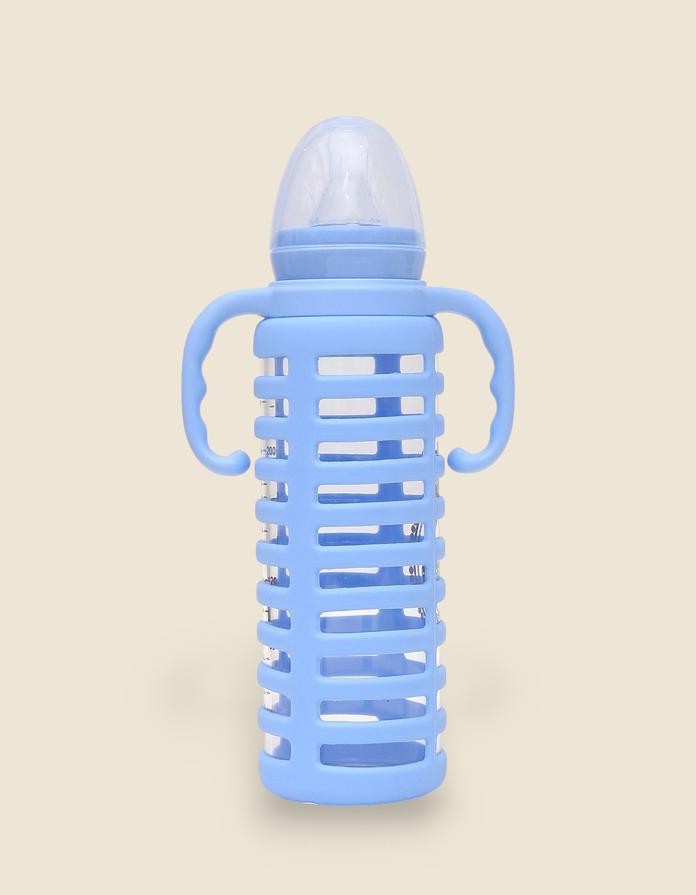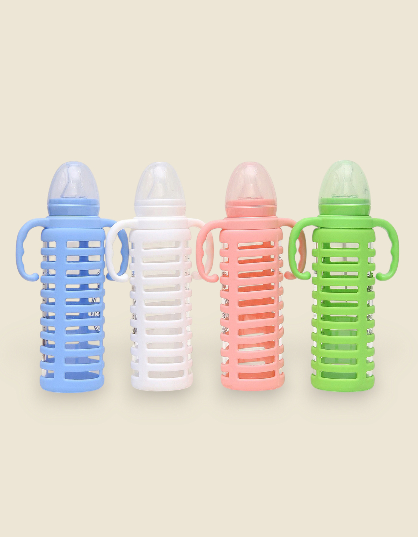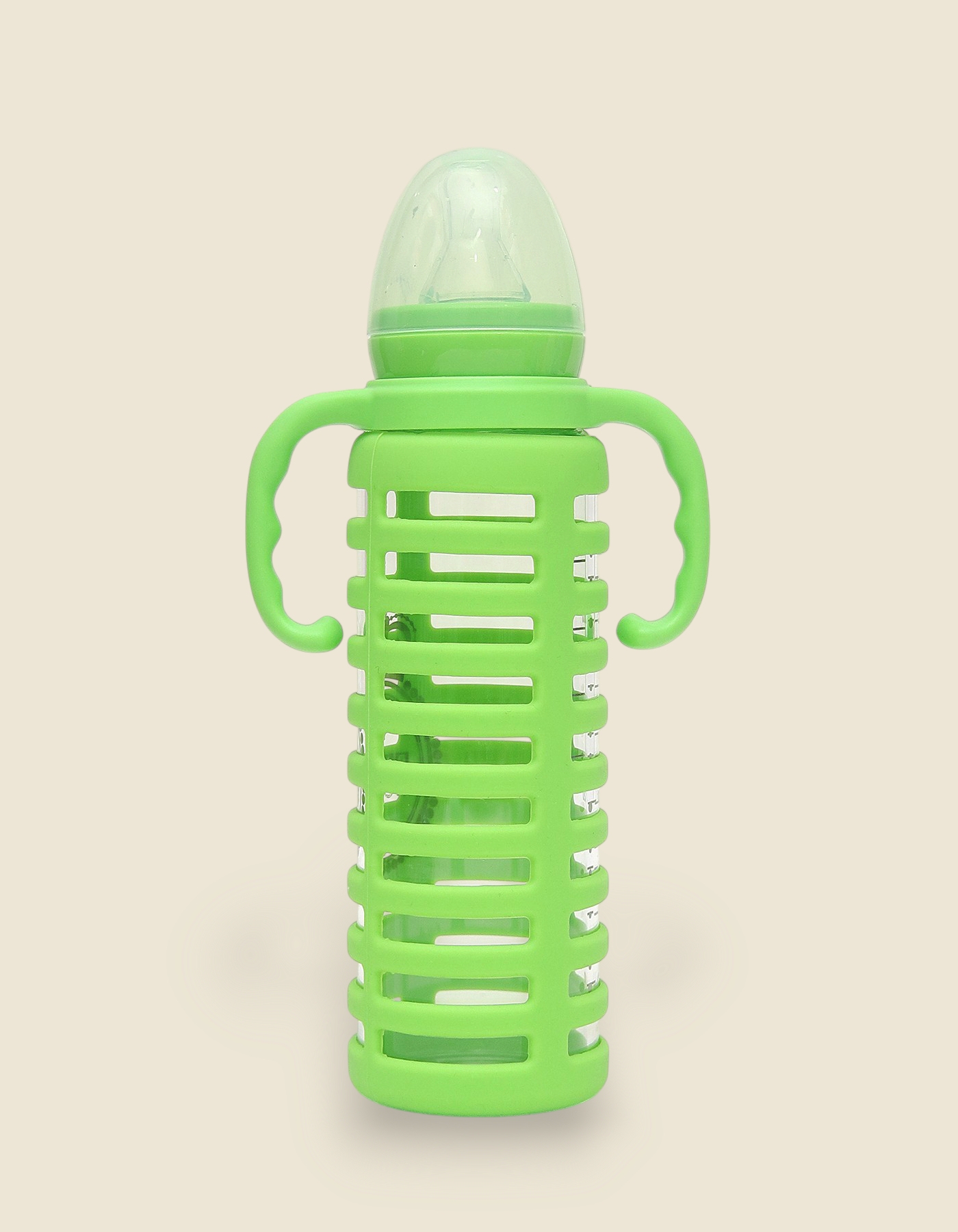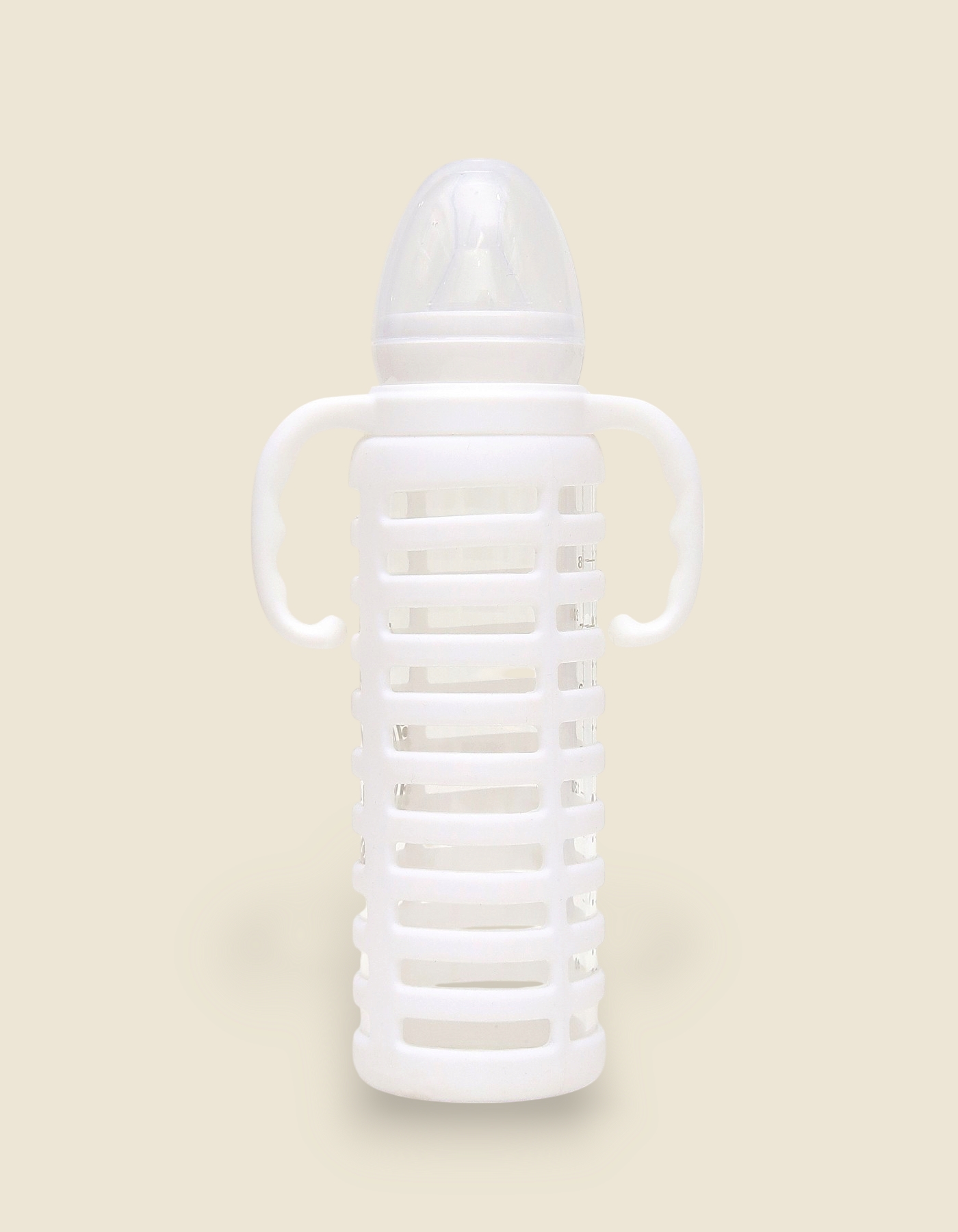The Tall Glass Feeding Bottle with Handles is designed for comfort, safety, and independence during feeding. Made from high-quality, BPA-free glass, it ensures hygiene and durability. The longer capacity design makes it perfect for growing babies who need more feed in one go. Each bottle comes with a removable silicone protective cover that provides shock resistance, prevents slipping, and adds a modern look. The dual side handles are ergonomically shaped, allowing little hands to grip the bottle securely and practice self-feeding. The soft silicone nipple ensures a natural breastfeeding-like experience, reducing nipple confusion. Available in four colors Baby Pink, Sky Blue, Fresh Green, and Pure White – to suit every style.