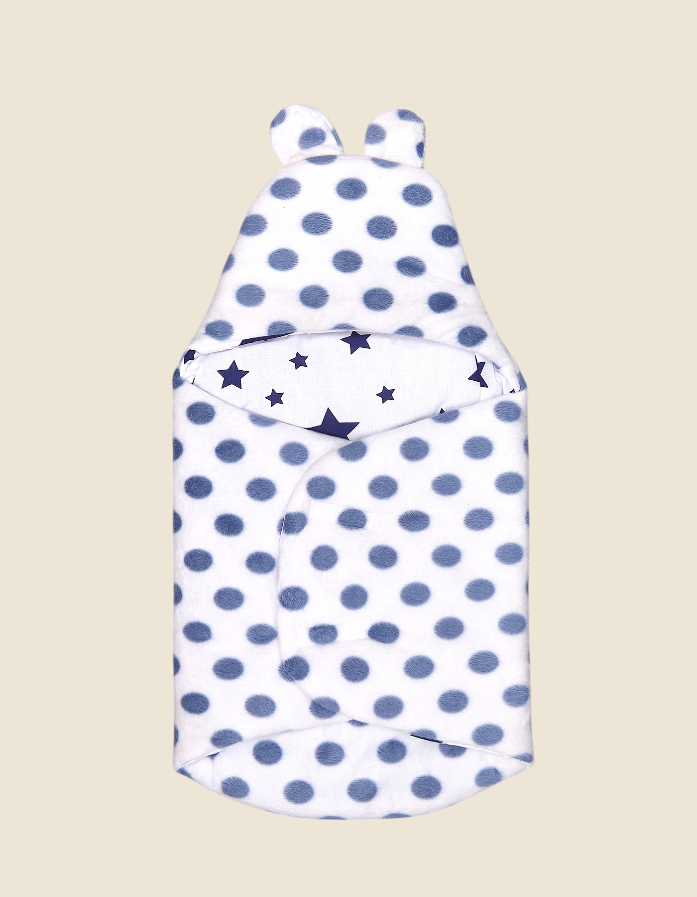 A soft, plush baby wrap swaddle with a hood and cute ear details. White with navy polka dots on the outside and a star print lining. Cozy, easy to use, and great for newborns.