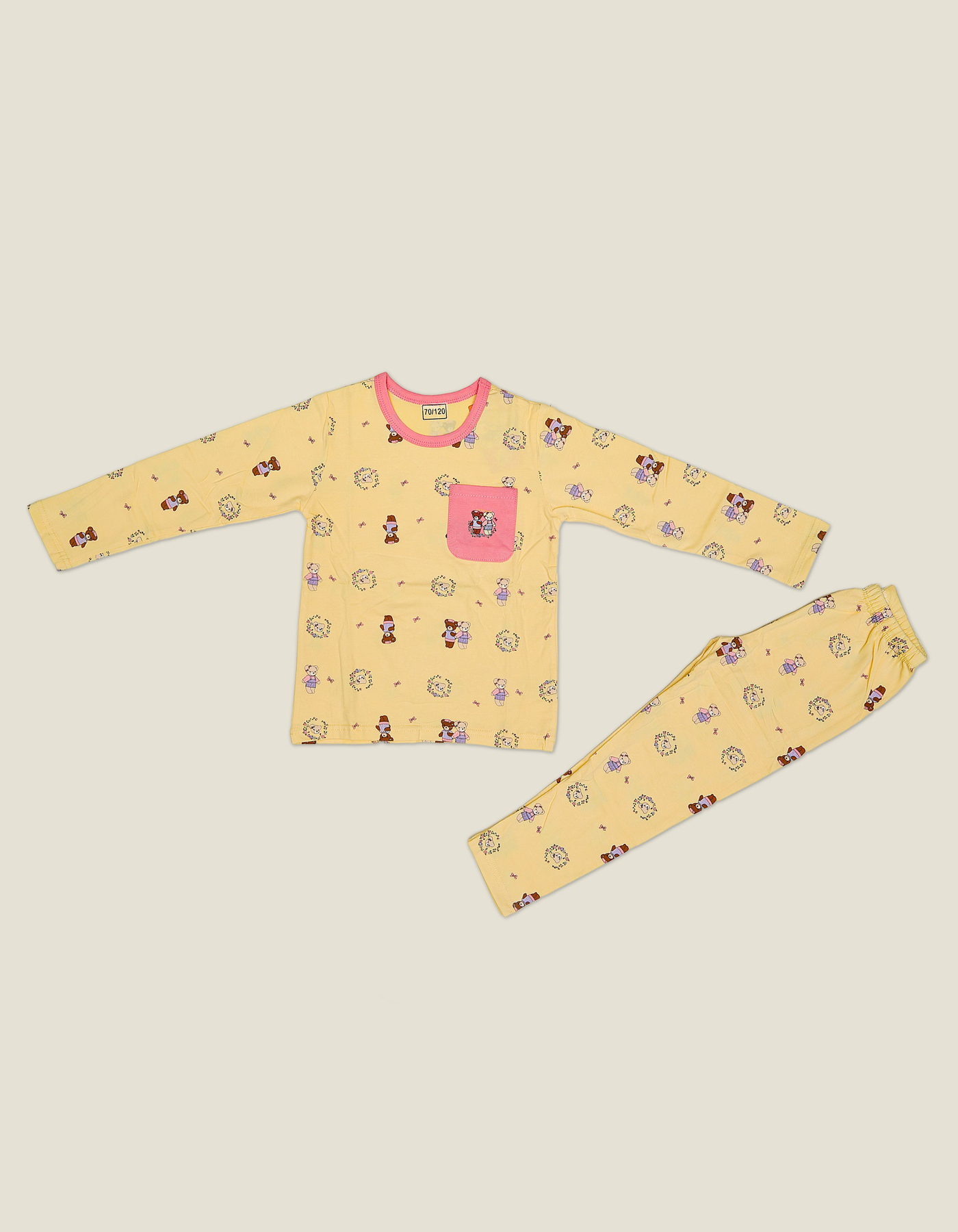 Cute and cheerful, this girls tracksuit features an adorable teddy bear and floral wreath print. Designed in a bright yellow shade with a pink pocket detail, it offers comfort and charm in one.
