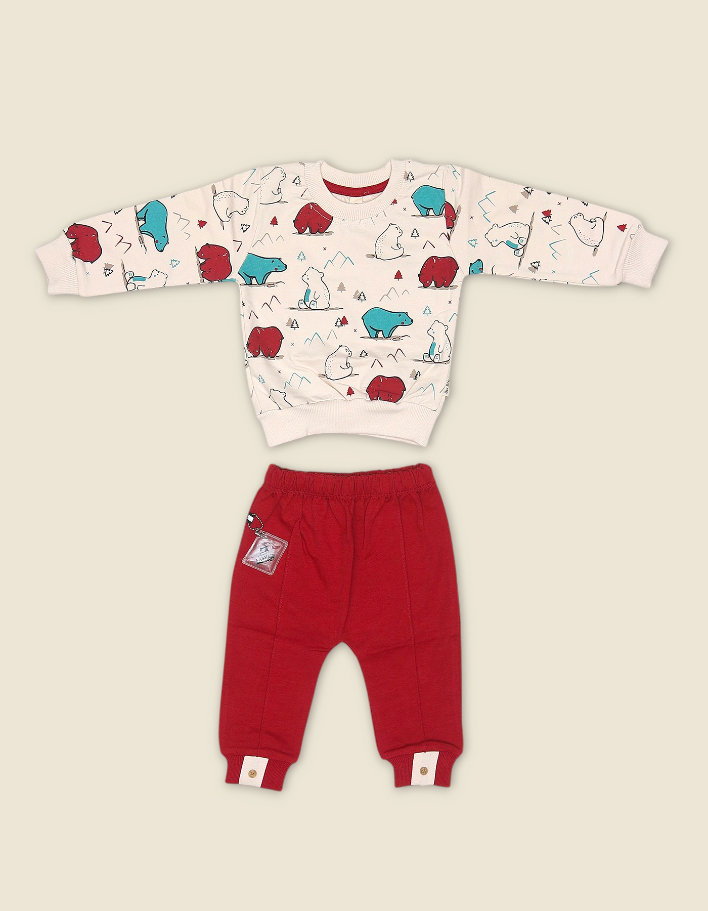 Soft and cozy baby outfit with bear and mountain print. Includes long sleeve sweatshirt and matching pants in solid colors.