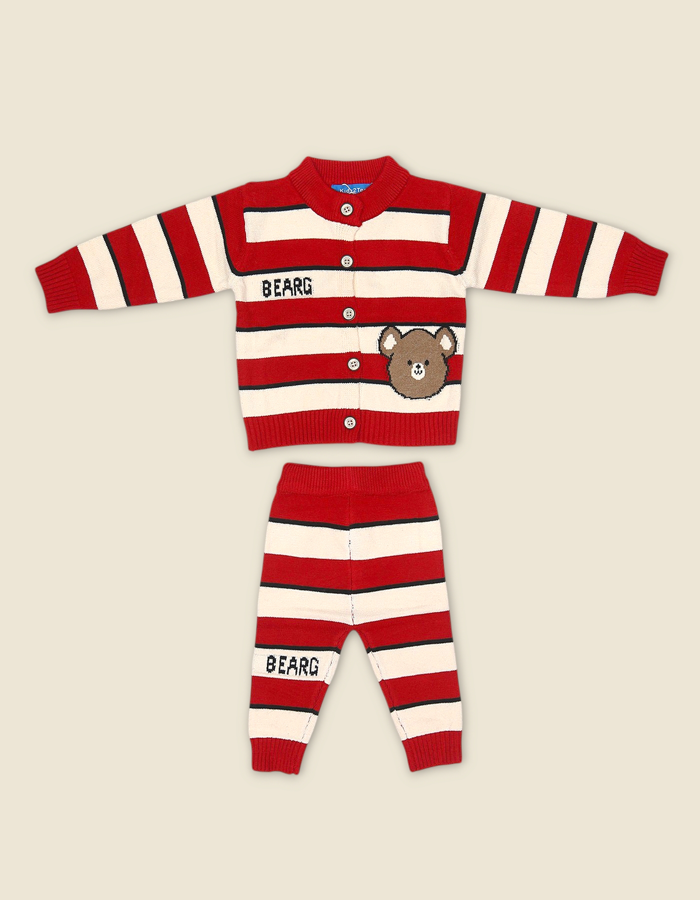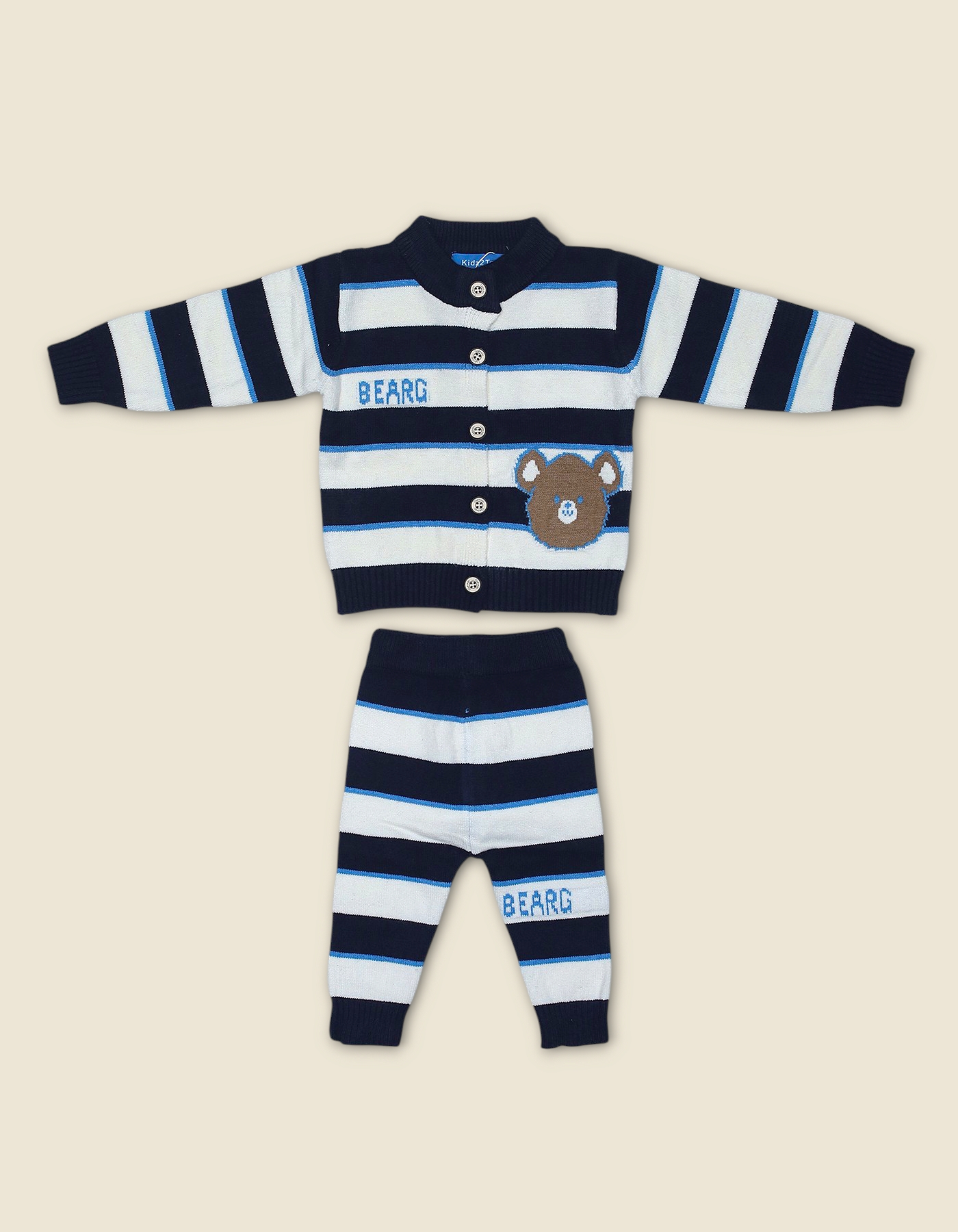 Playful woolen outfit for boys with bear embroidery and striped design. Features button-up sweater and matching pants for cozy winter wear.