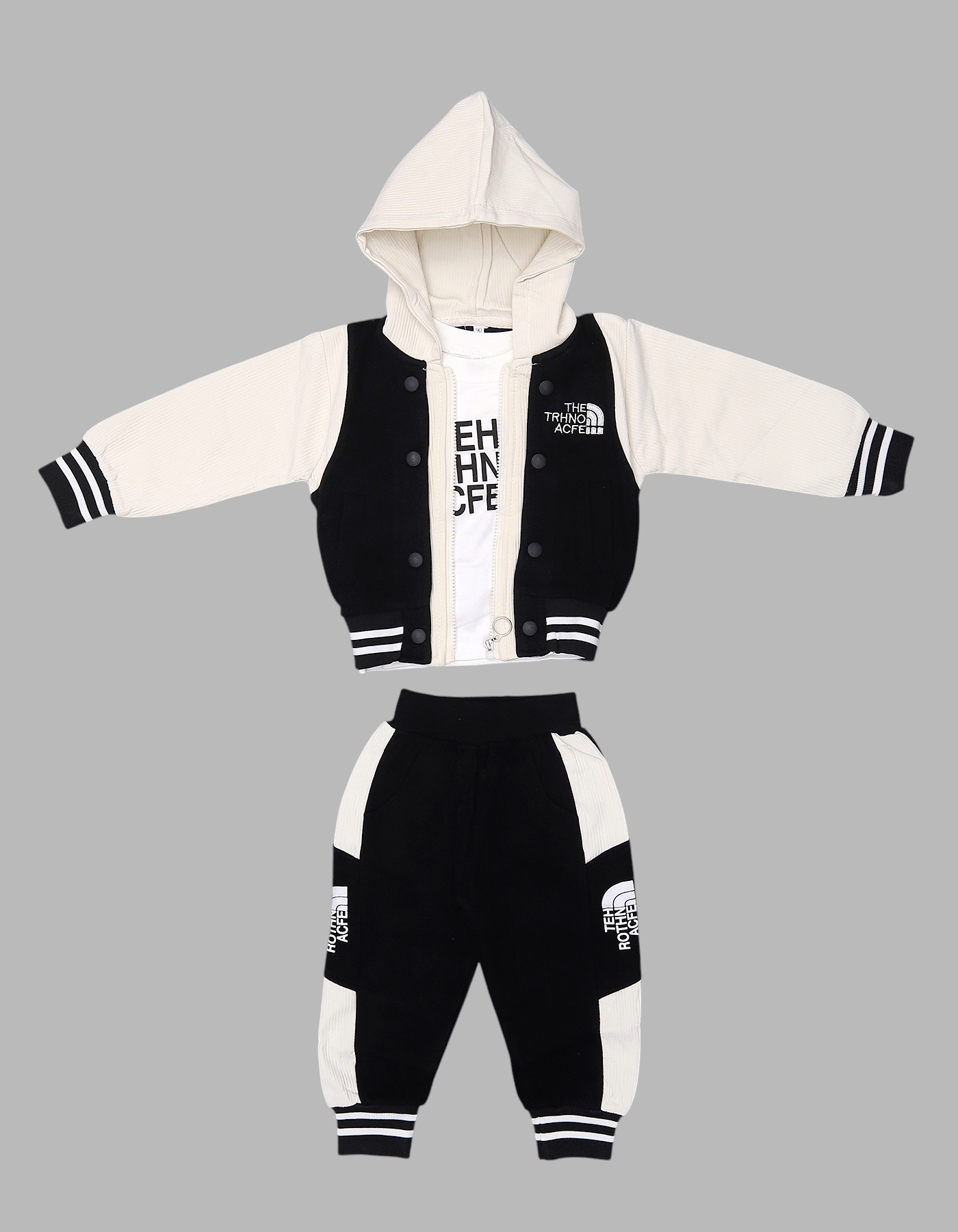 Give your little one a cool and sporty vibe with this black and white varsity-style 3-piece suit. The set includes a hooded jacket with button closure, a matching printed T-shirt, and jogger pants with coordinated panel detailing. Designed for both comfort and style, this outfit is perfect for school, outings, or casual everyday wear.