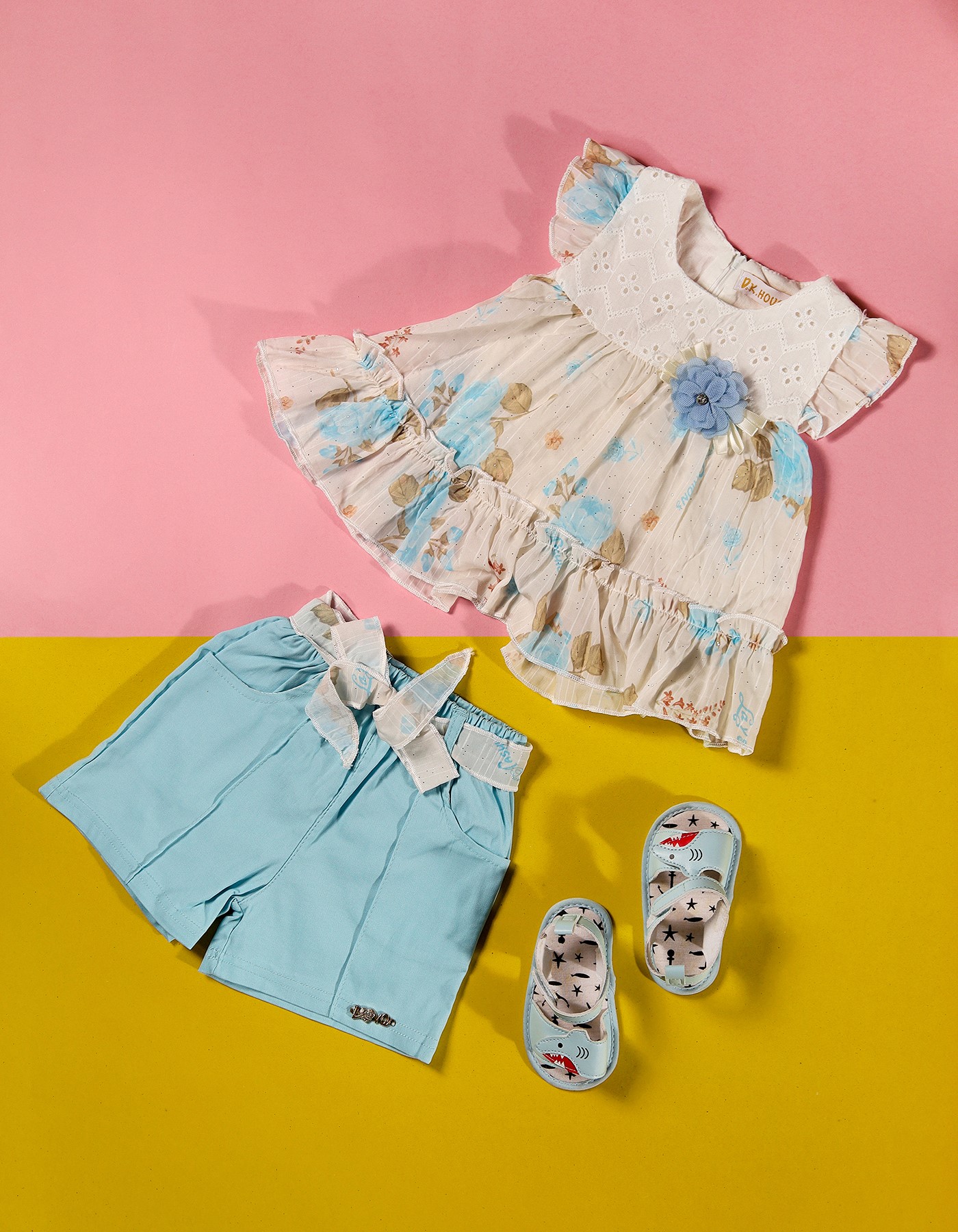 A charming baby girl outfit featuring a floral ruffle frock with a lace neckline and a matching pair of blue shorts, paired with cute matching sandals for a stylish summer look.