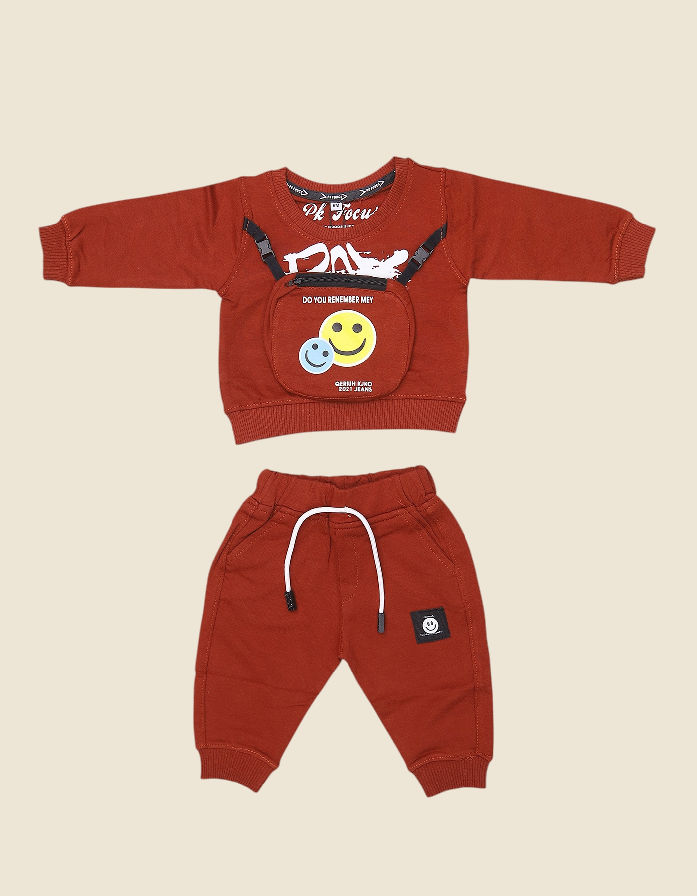 Bring cheerful vibes to your boys wardrobe with this trendy 2-piece smiley-themed suit. The set features a playful sweatshirt with an attached mini pouch design and a pair of comfy jogger pants. Available in both blue and brown, this outfit combines casual comfort with a fun, expressive style perfect for everyday wear, playdates, or outings.