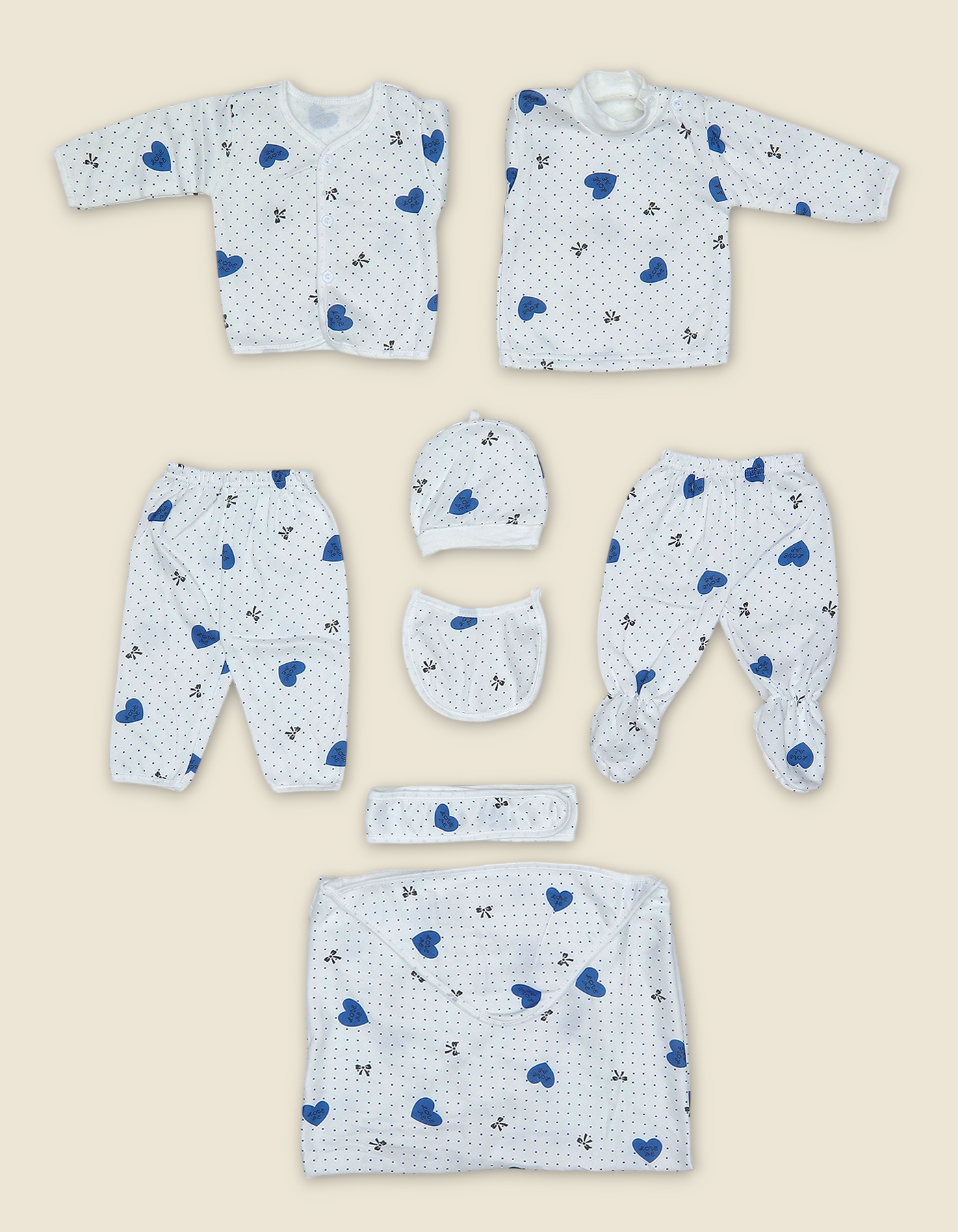 Soft and coordinated starter set for newborns with blue heart and dot print. Includes essential clothing and accessories for comfort and gifting.