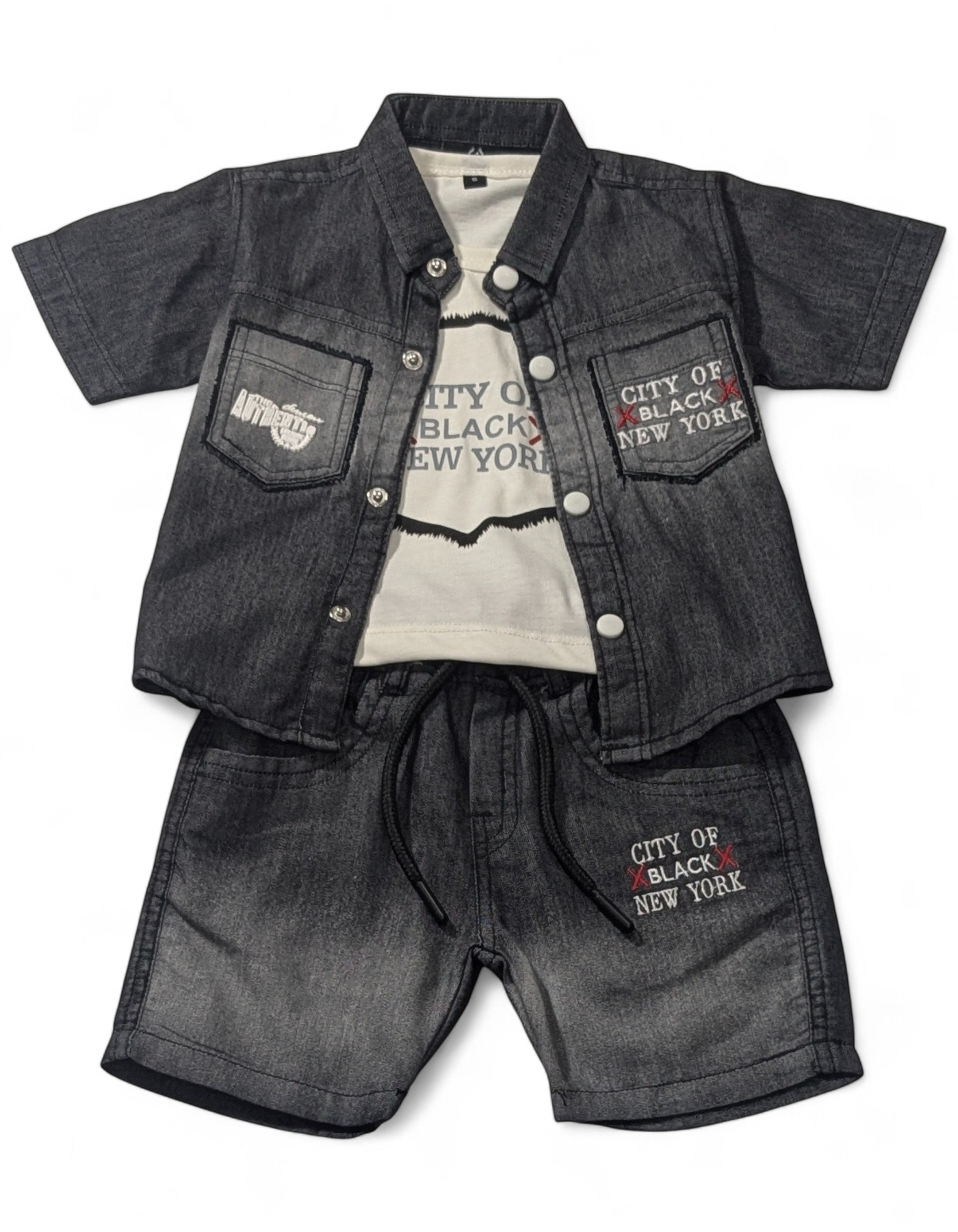 Urban Legend: Boys' 3-Piece Black Denim "City of New York" Set Bring some big-city energy to his wardrobe with this edgy and durable coordinated set. Featuring a monochromatic charcoal and black palette with bold typography, this outfit is designed for the modern "cool kid".