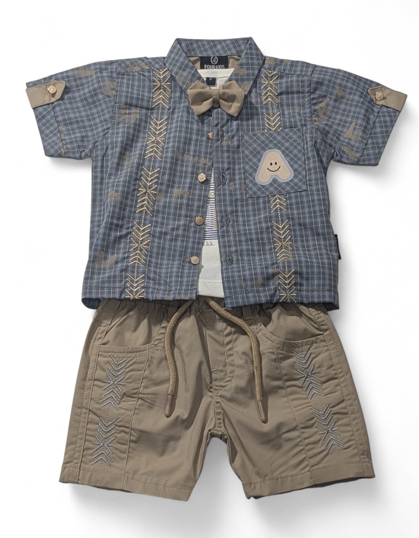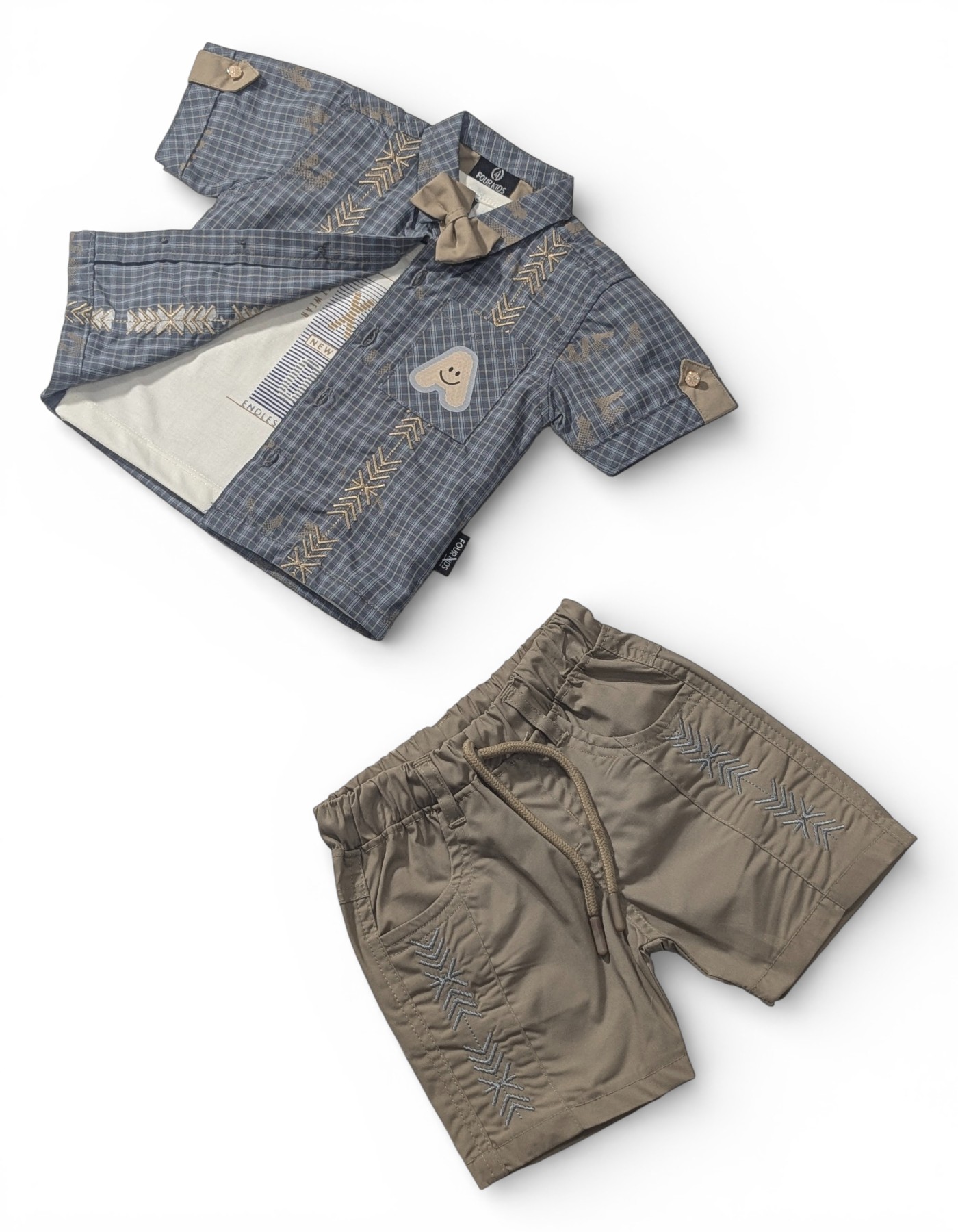 Smart Style: Boys' 3-Piece Plaid Shirt, Bow Tie & Khaki Shorts Set Elevate his wardrobe with this expertly coordinated ensemble. Featuring a refined dark grey micro-plaid and warm khaki accents, this set delivers a polished appearance without sacrificing the comfort a busy toddler needs.