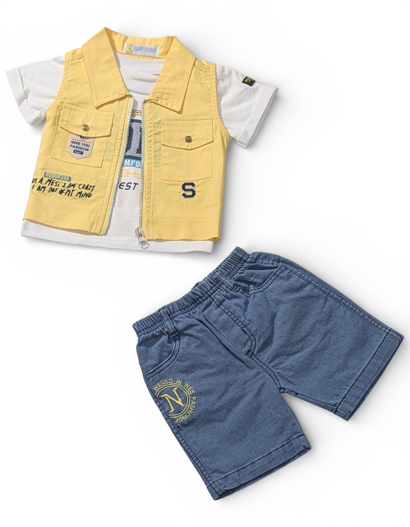 Urban Edge: Boys' 3-Piece Zip-Up Vest & Denim Shorts Set Give his wardrobe a pop of personality with this high-energy, street-style ensemble. Featuring a bold mustard yellow utility vest and classic denim-style shorts, this 3-piece set is the perfect mix of rugged durability and modern fashion.