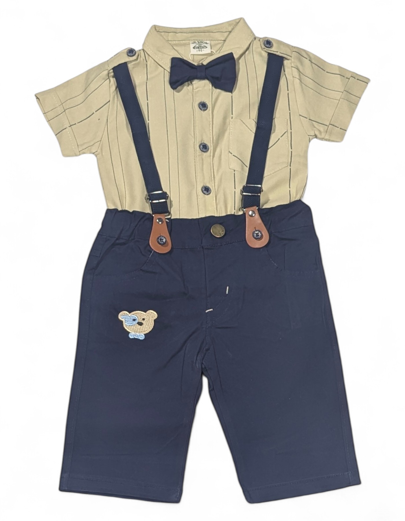 The Accessories: Elasticized navy blue suspenders with stylish brown faux-leather tabs and a coordinating navy bow tie.