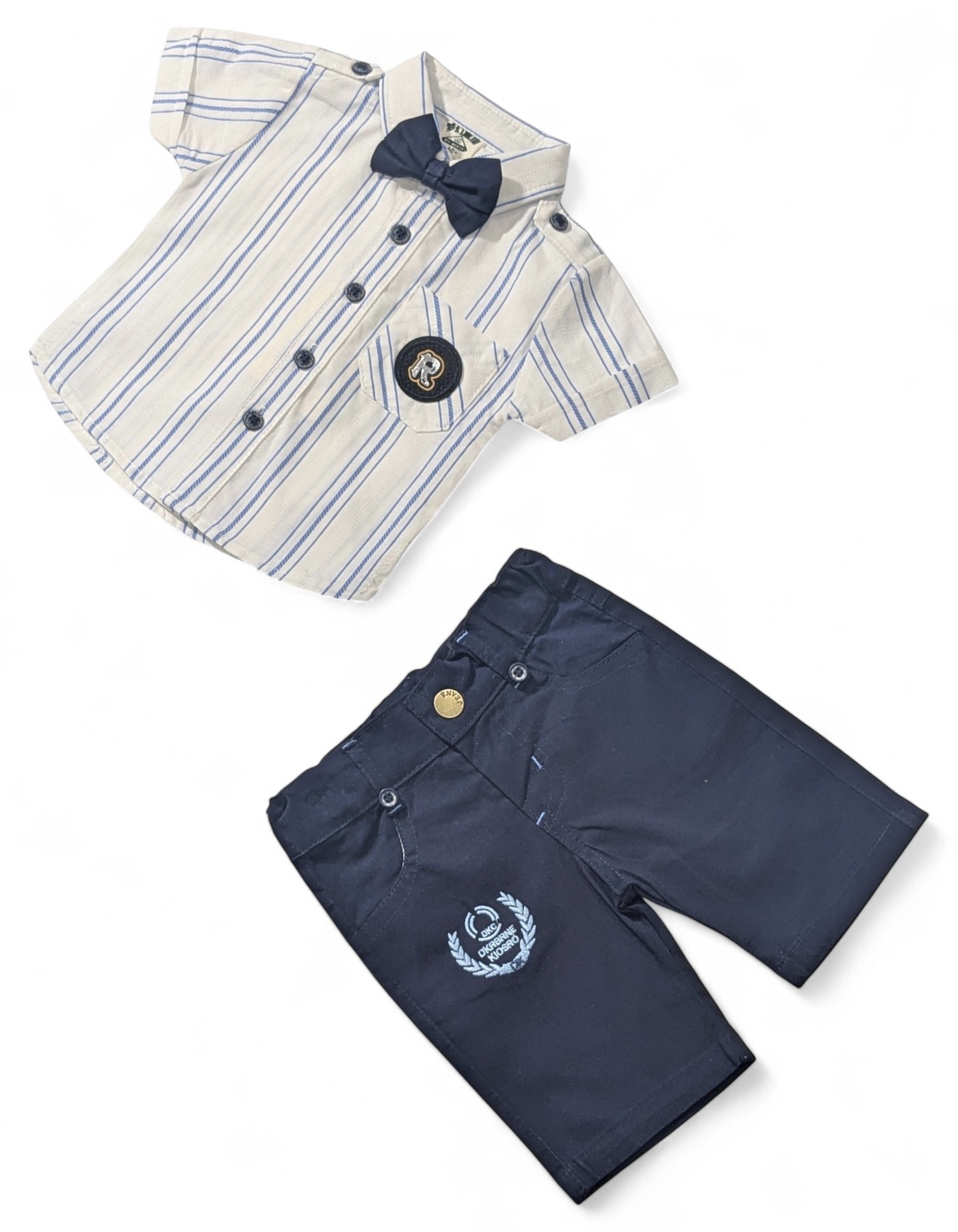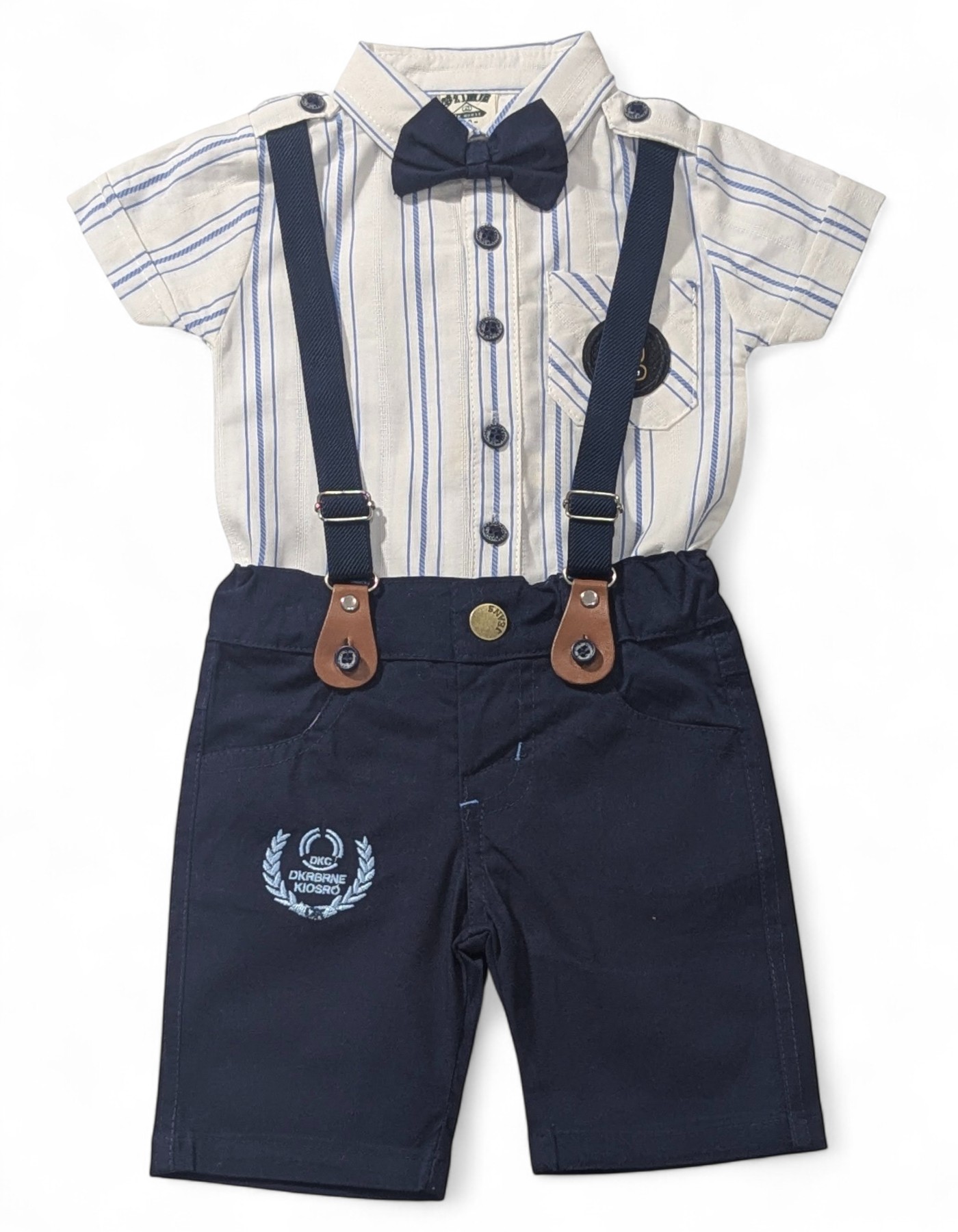 Complete 4-Piece Outfit: Includes a striped button-down shirt, a pre-tied bow tie, adjustable navy suspenders, and tailored shorts.