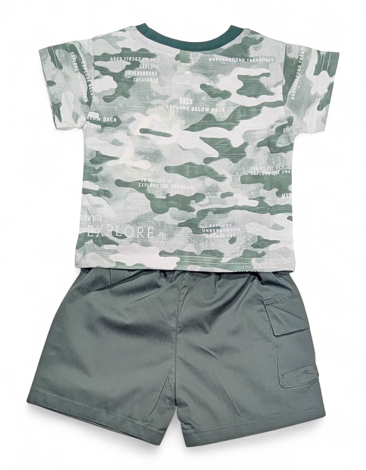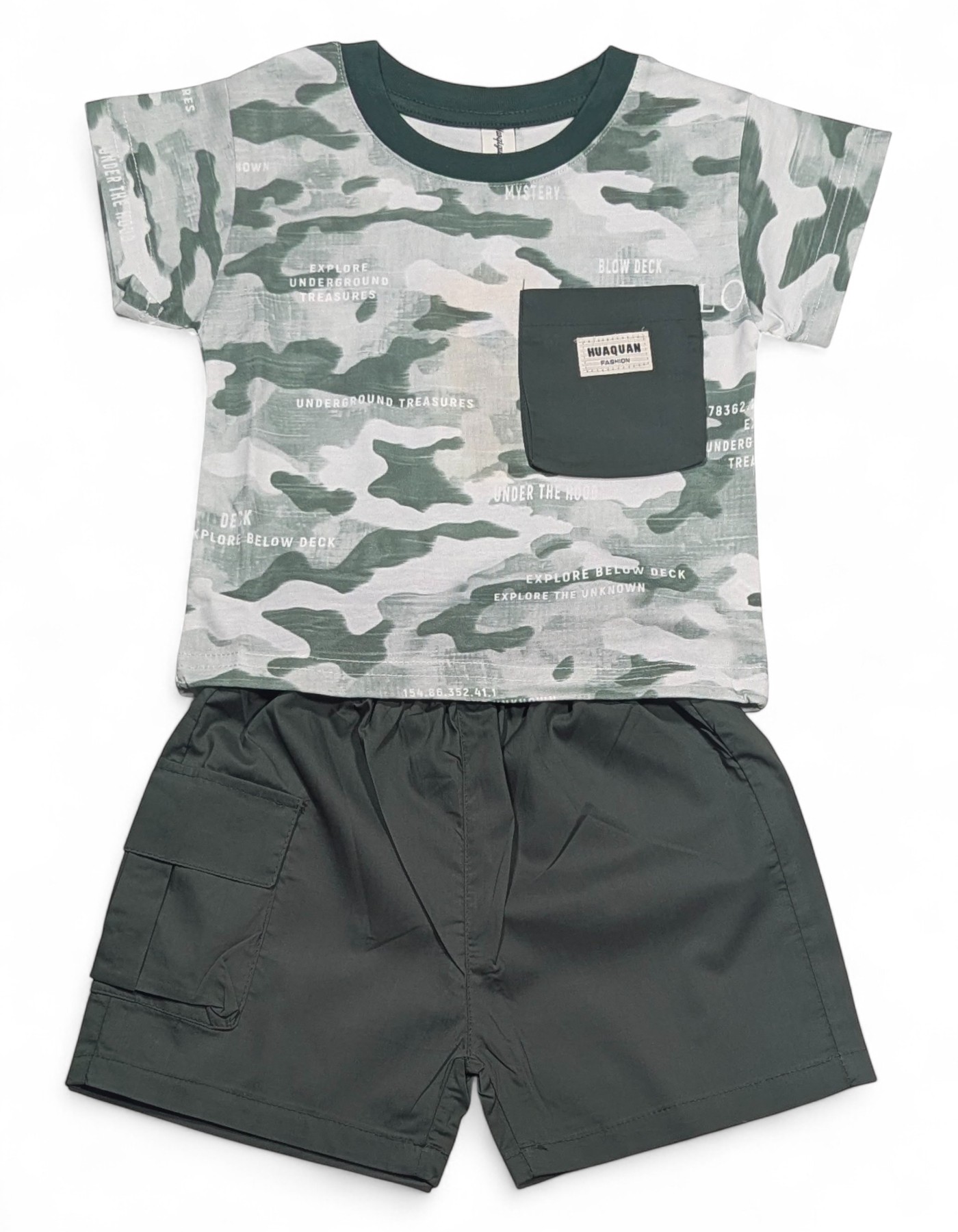 Boys Camouflage T-Shirt & Cargo Shorts Suit – Green Add a cool, adventure-ready vibe to your little one’s wardrobe with this stylish two-piece boys suit. The camouflage-print T-shirt features a soft round neck and a trendy chest pocket detail, paired with solid cargo shorts designed for comfort and movement. Perfect for active days and casual outings.