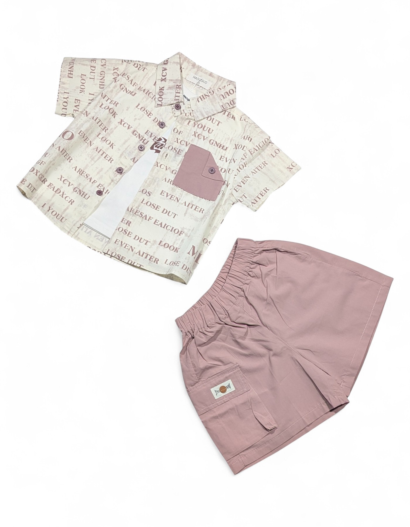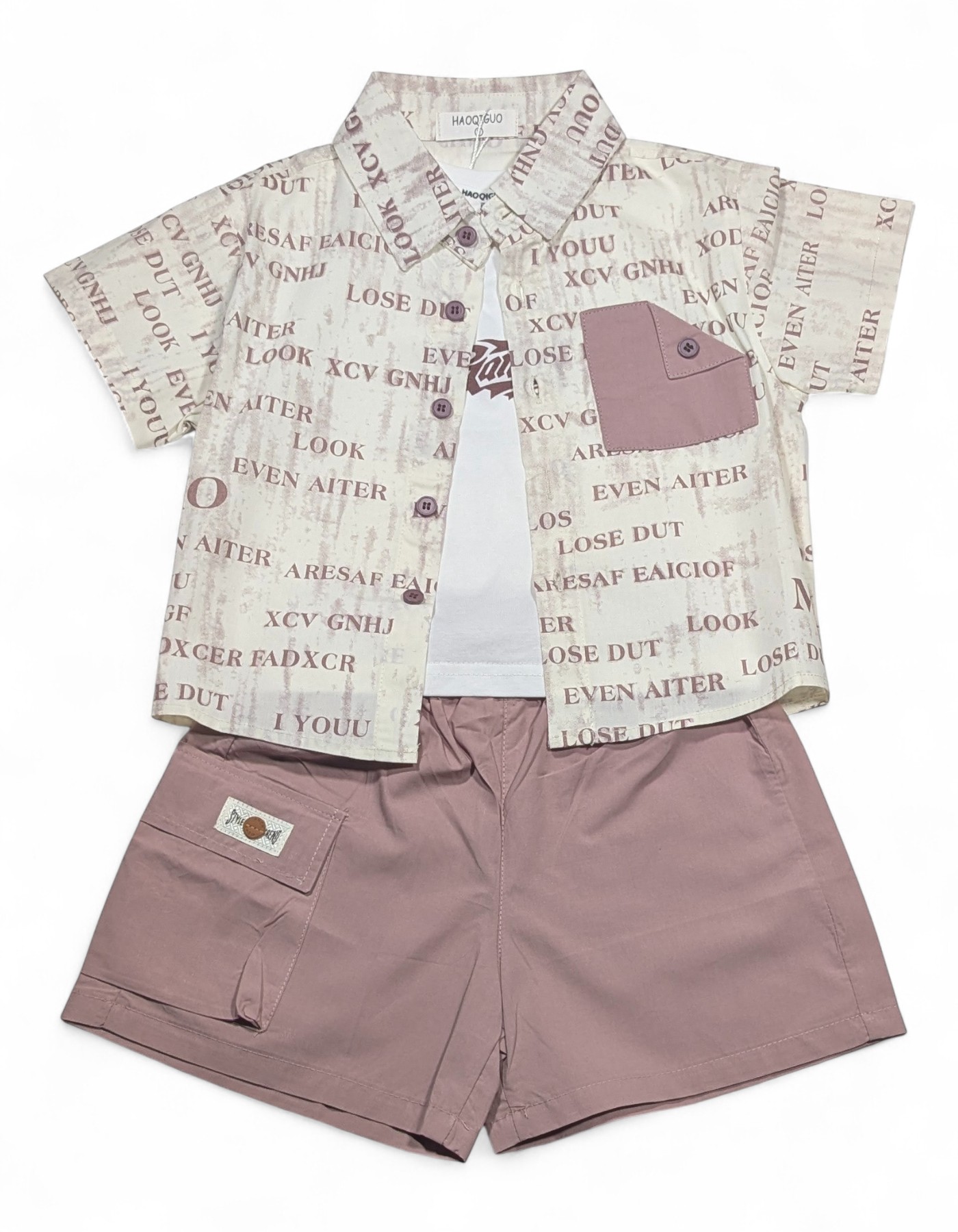 Boys Printed Shirt, T-Shirt & Shorts Suit – Pink Dress your little one in effortless style with this fashionable three-piece boys suit. Featuring a printed short-sleeve shirt layered over a soft inner T-shirt and paired with comfortable matching shorts, this outfit delivers a smart yet playful look. The coordinated colors and modern print make it perfect for both casual and semi-dressy occasions.